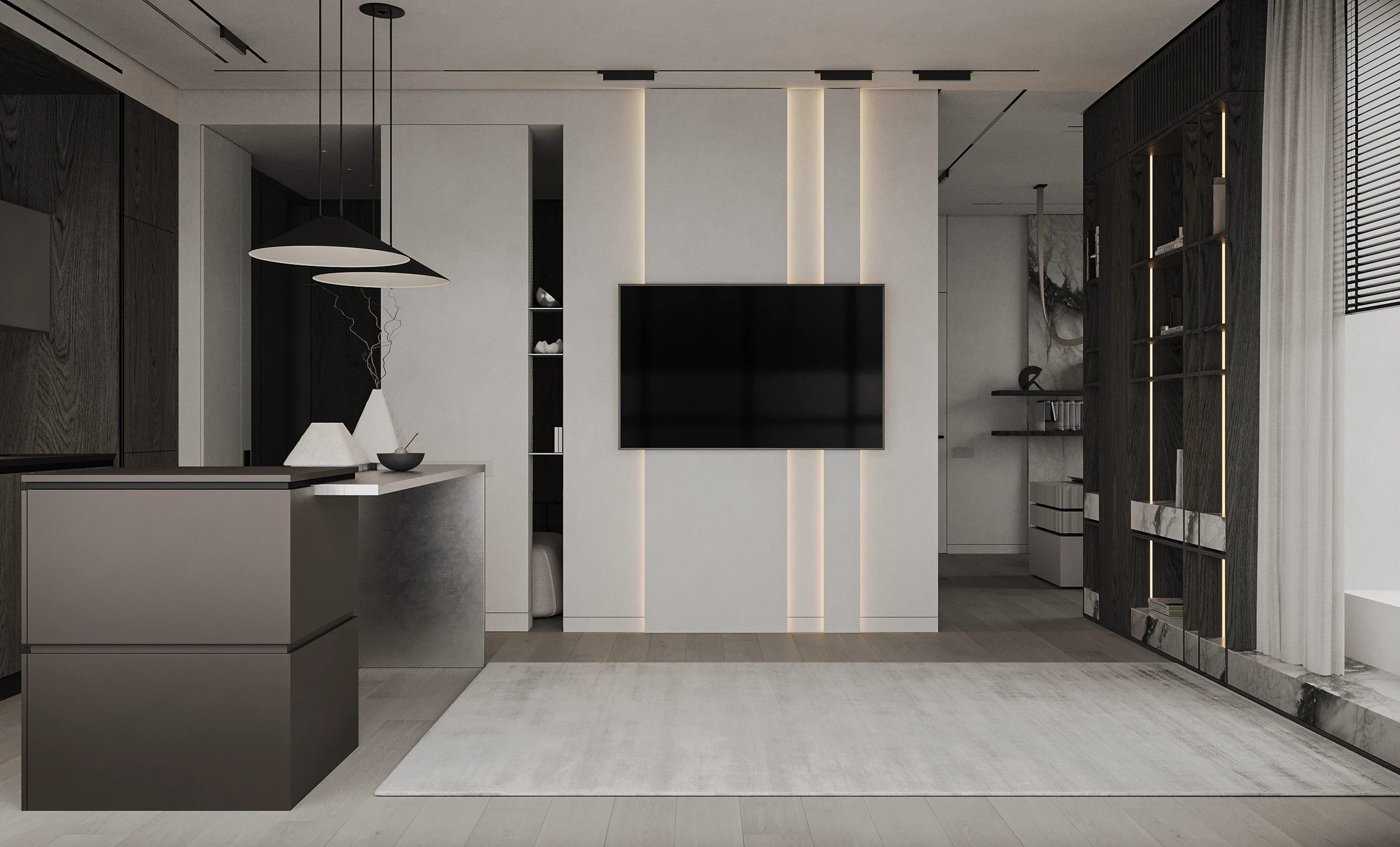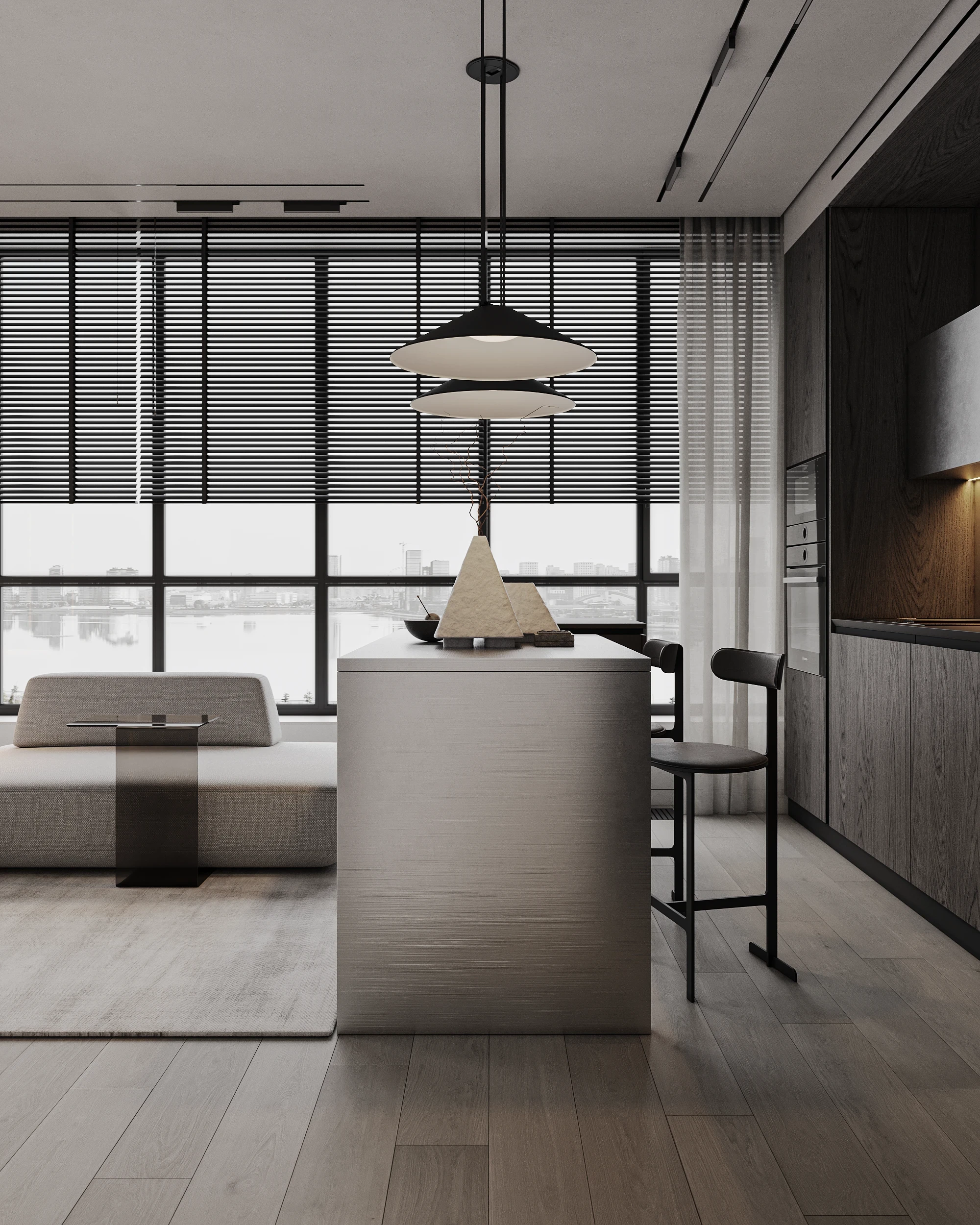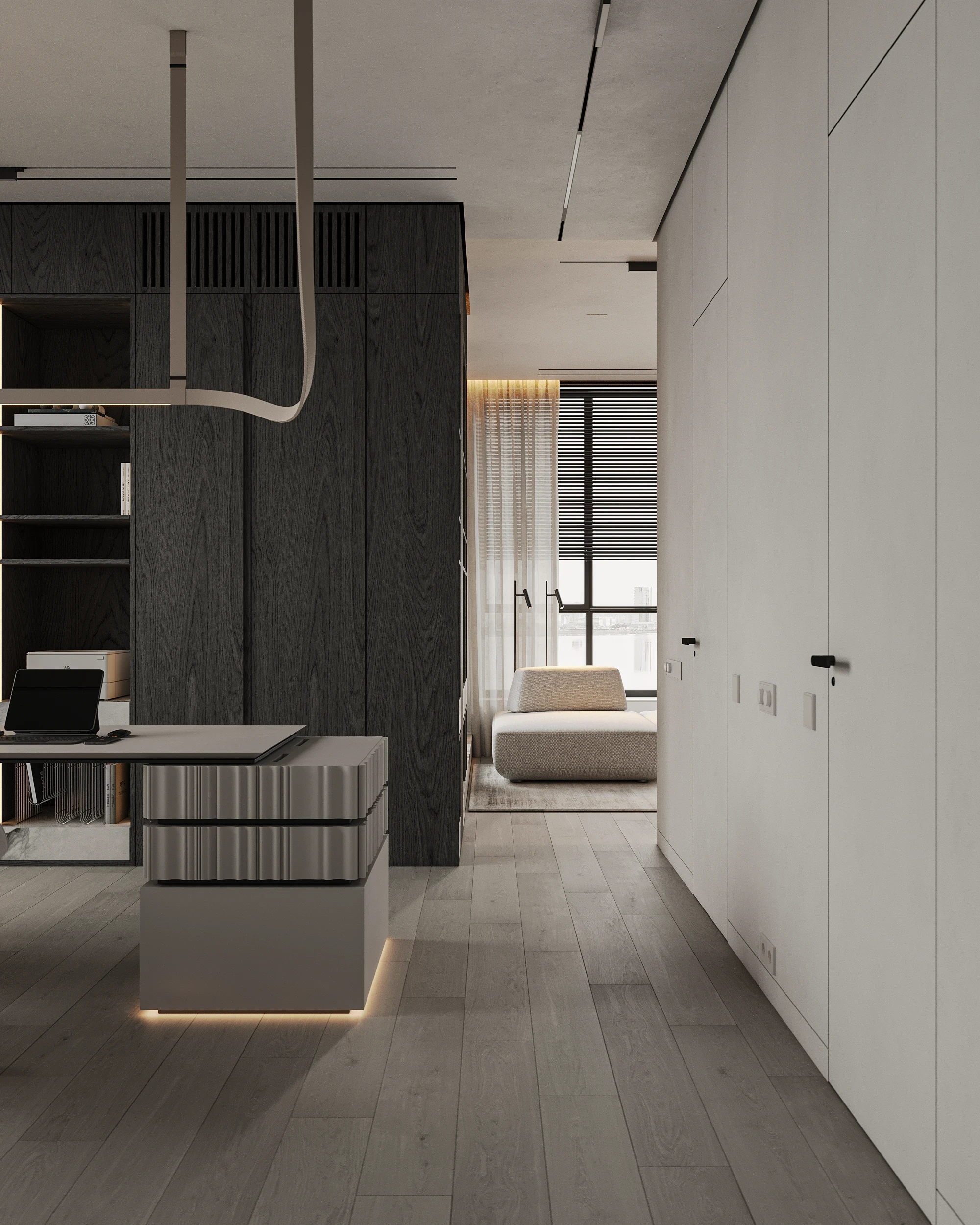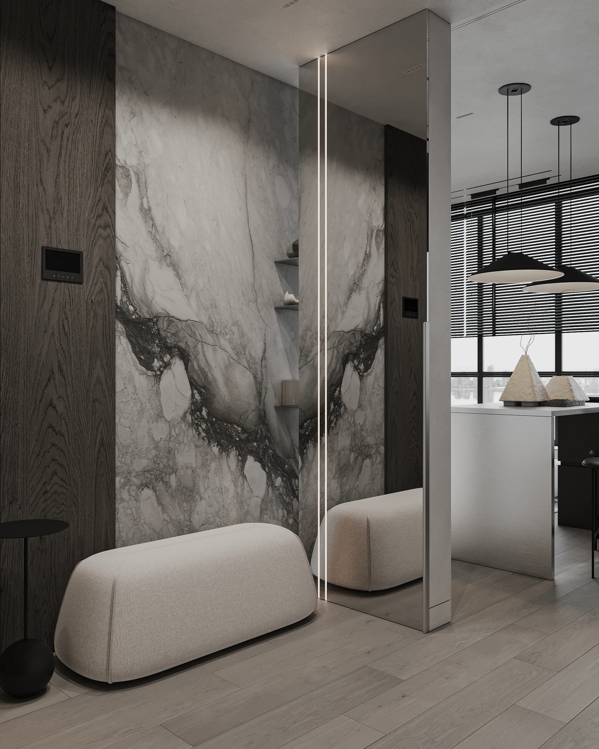 Інтер’єр, у якому камінь стає ритмом, а світло — м’яким продовженням форми. Простір побудований на стриманих текстурах, точних лініях та твердих матеріалах, що створюють атмосферу повної рівноваги. Тут кожна поверхня промовляє про якість, а кожен об’єм існує заради комфорту. Це проєкт, що поєднує монолітність і спокій, дозволяючи відчути власний темп життя.