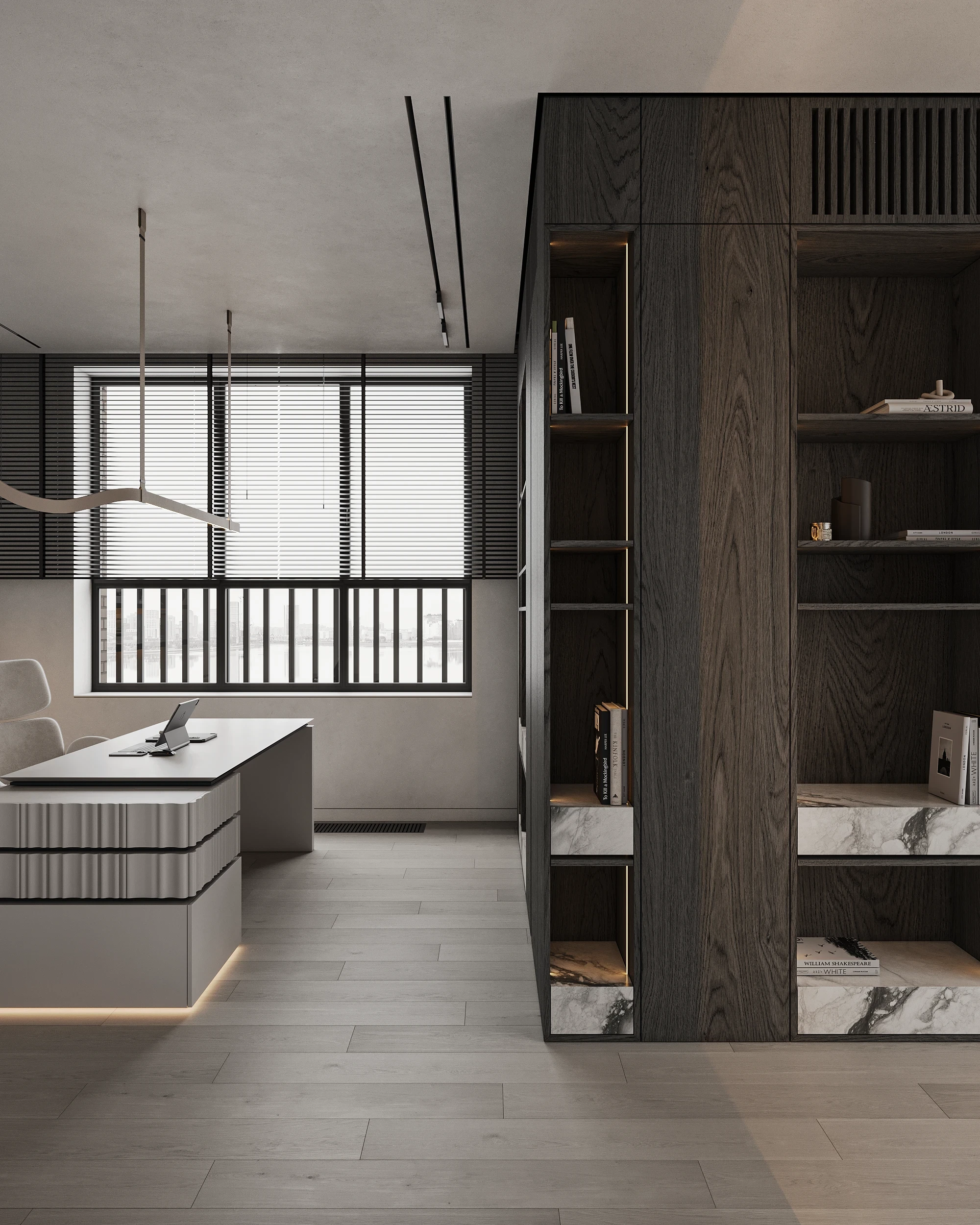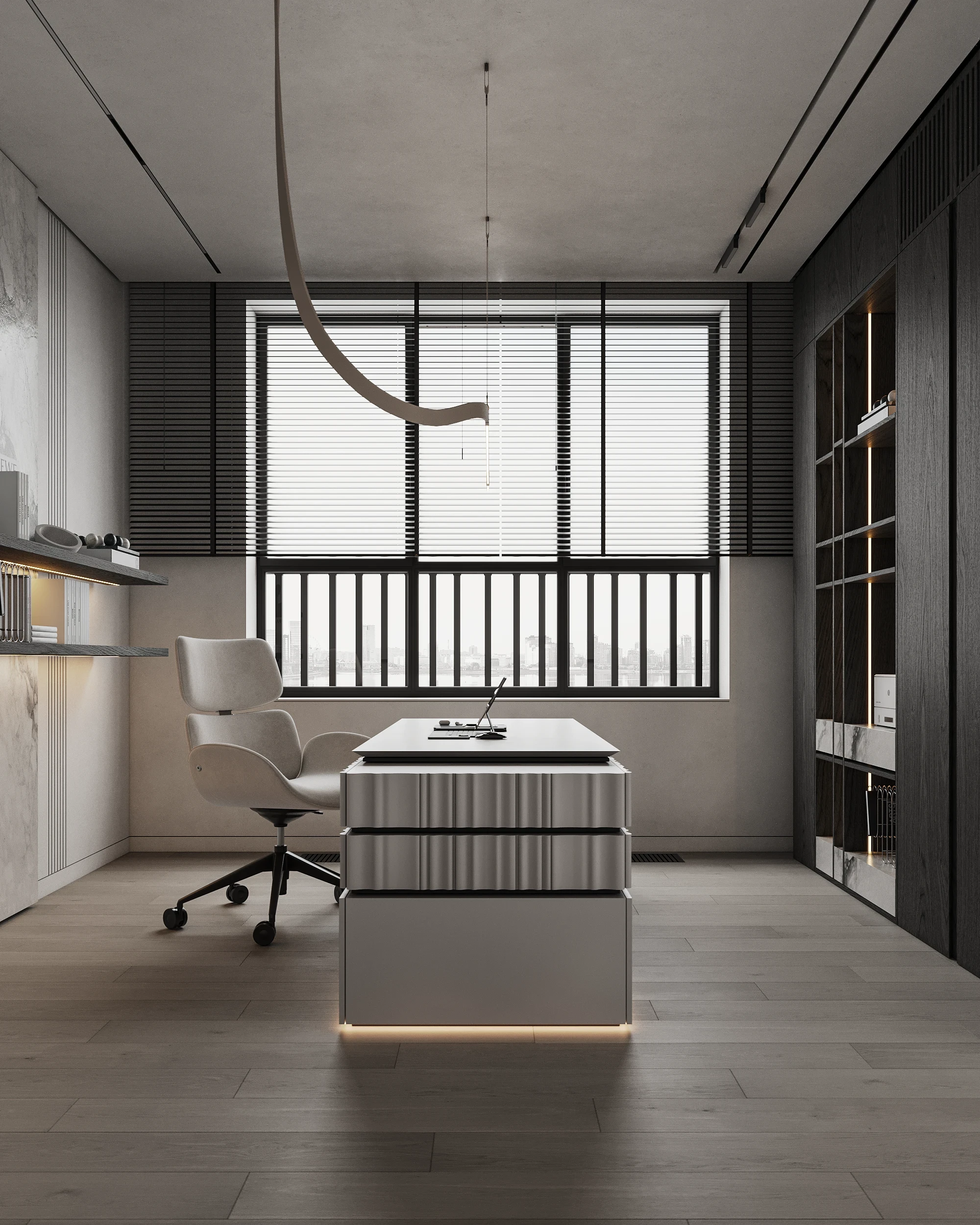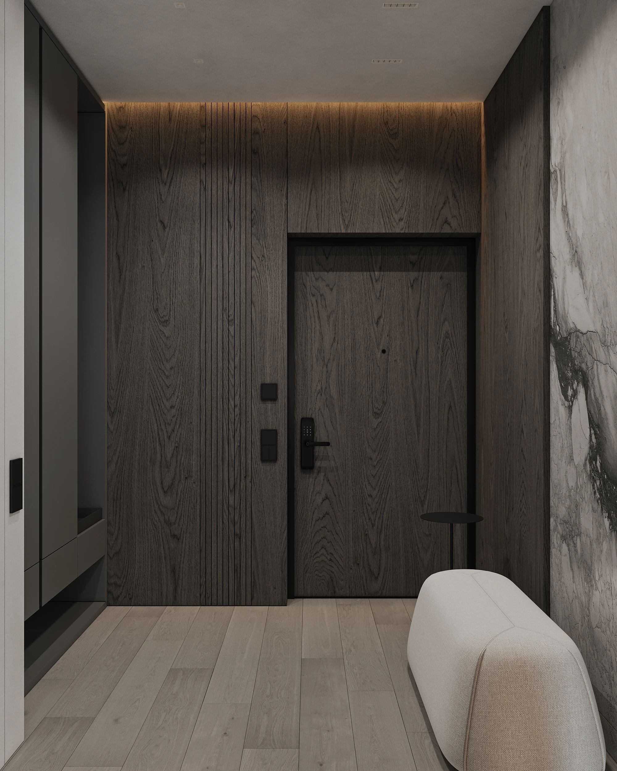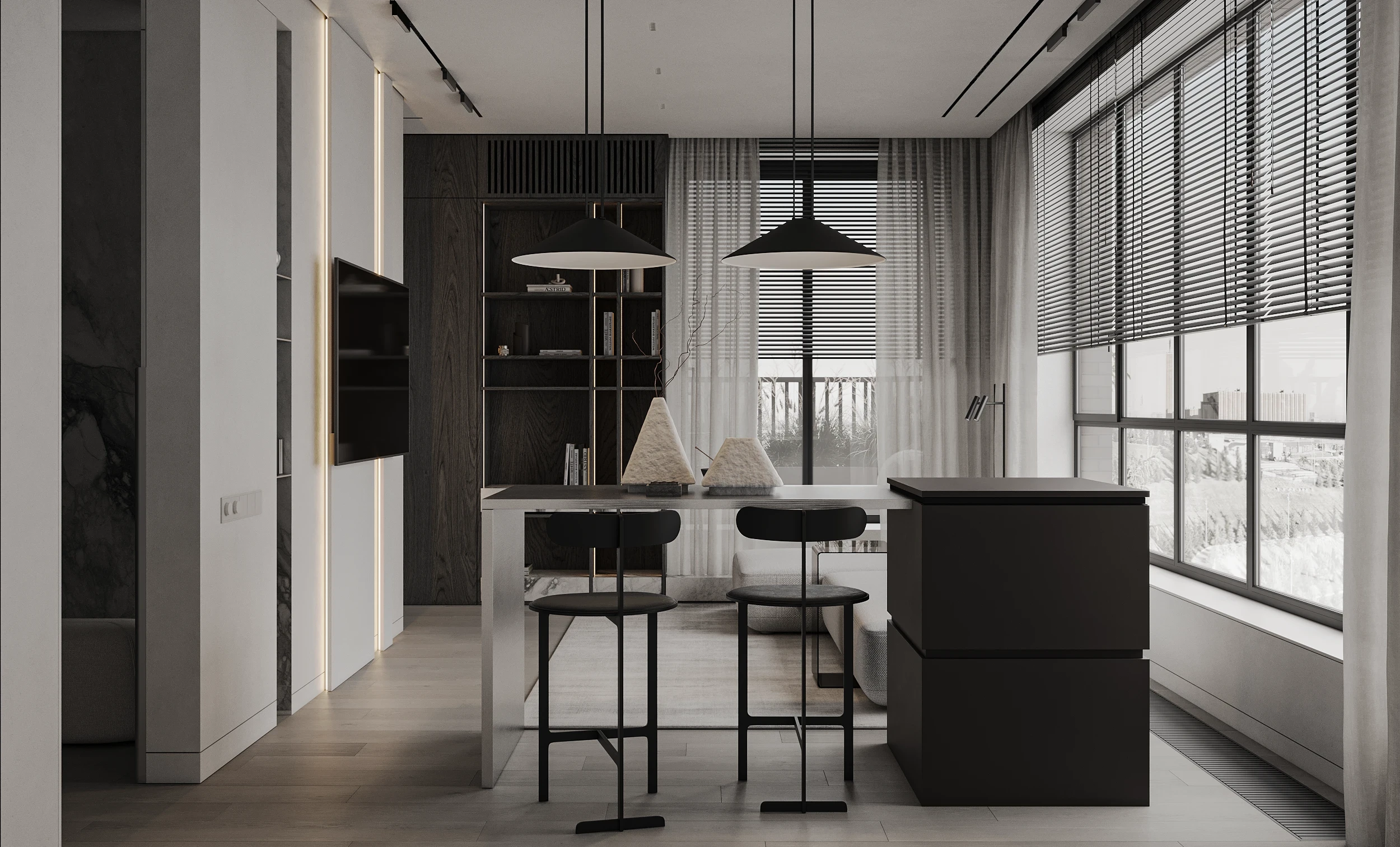 Інтер’єр, у якому камінь стає ритмом, а світло — м’яким продовженням форми. Простір побудований на стриманих текстурах, точних лініях та твердих матеріалах, що створюють атмосферу повної рівноваги. Тут кожна поверхня промовляє про якість, а кожен об’єм існує заради комфорту. Це проєкт, що поєднує монолітність і спокій, дозволяючи відчути власний темп життя.