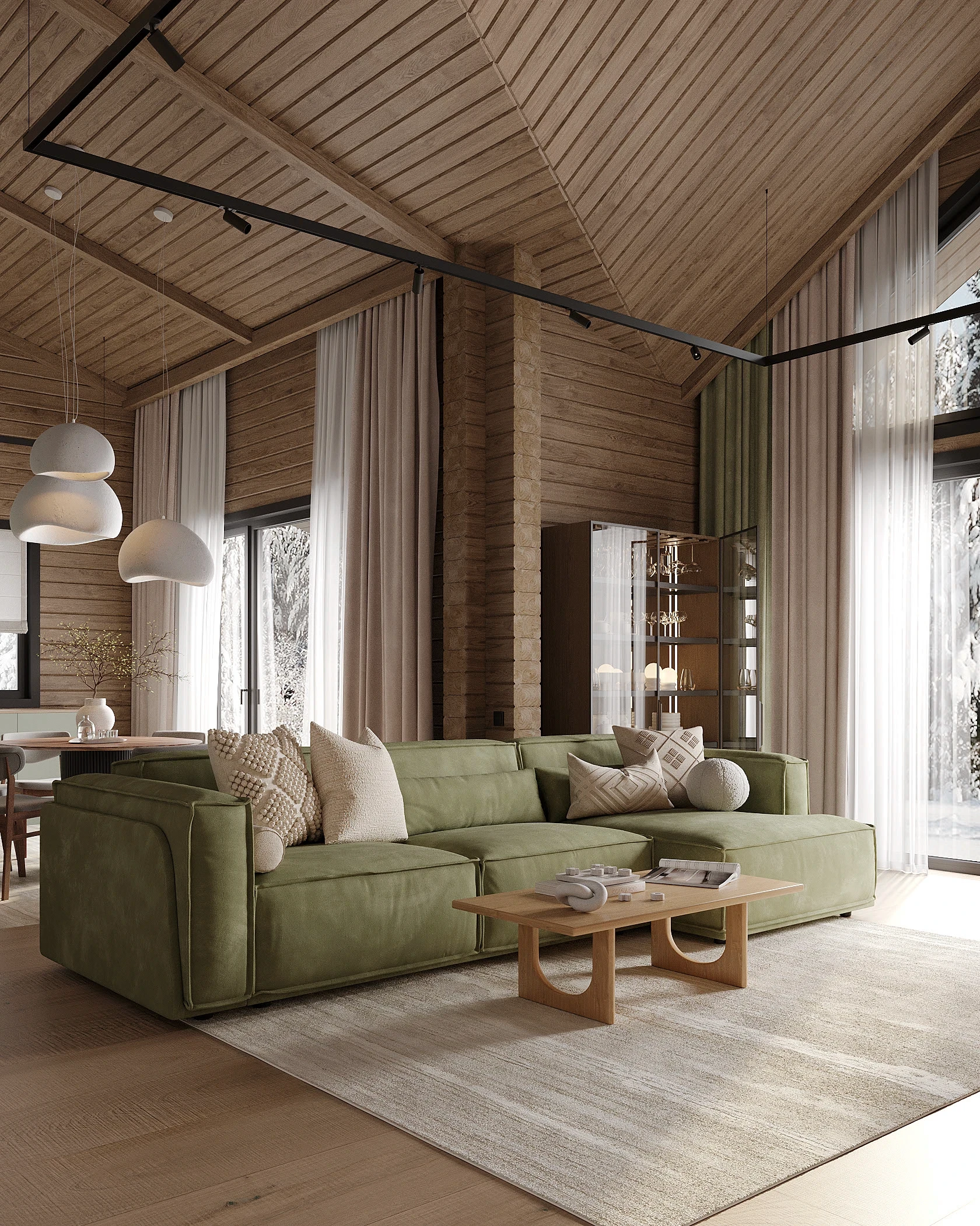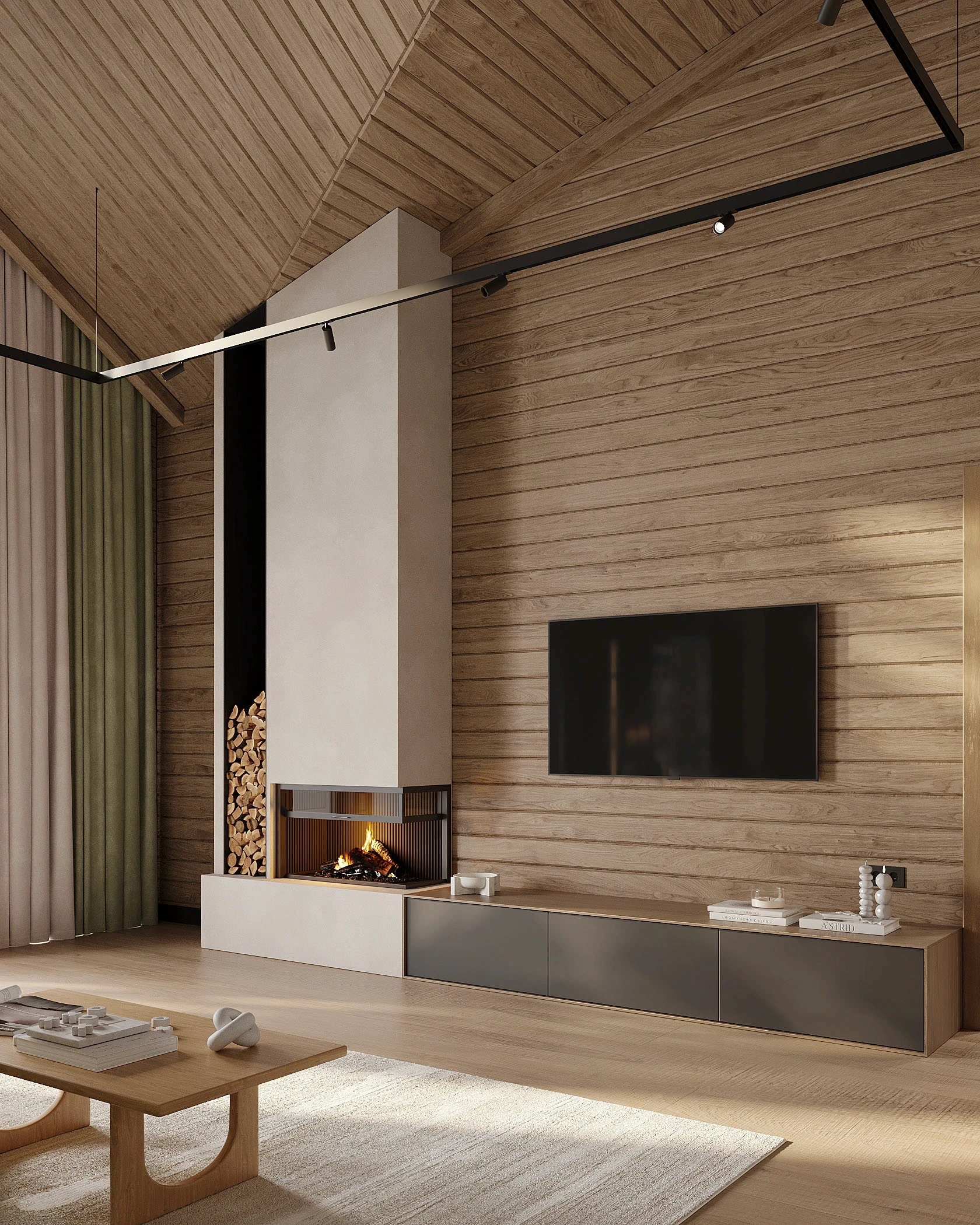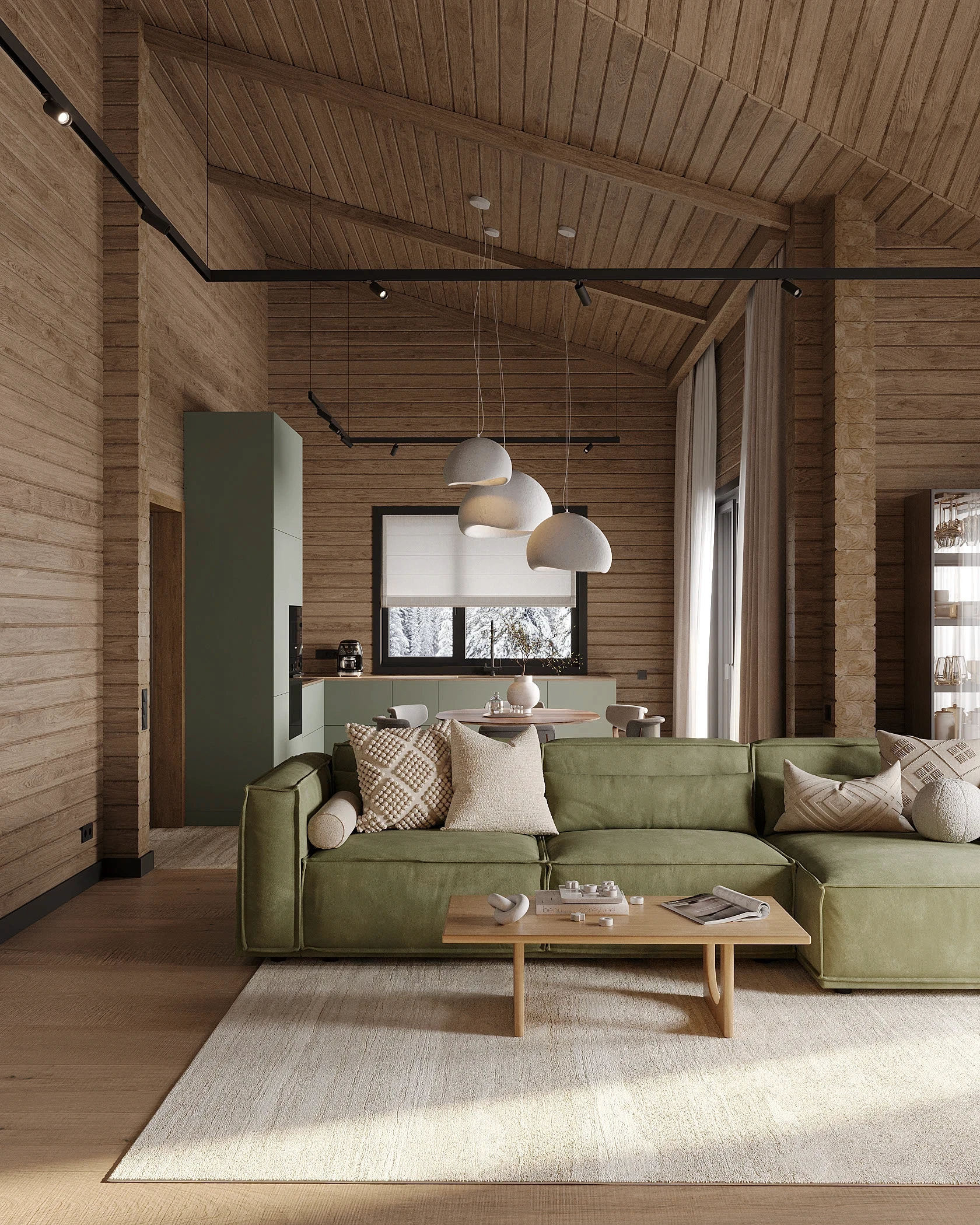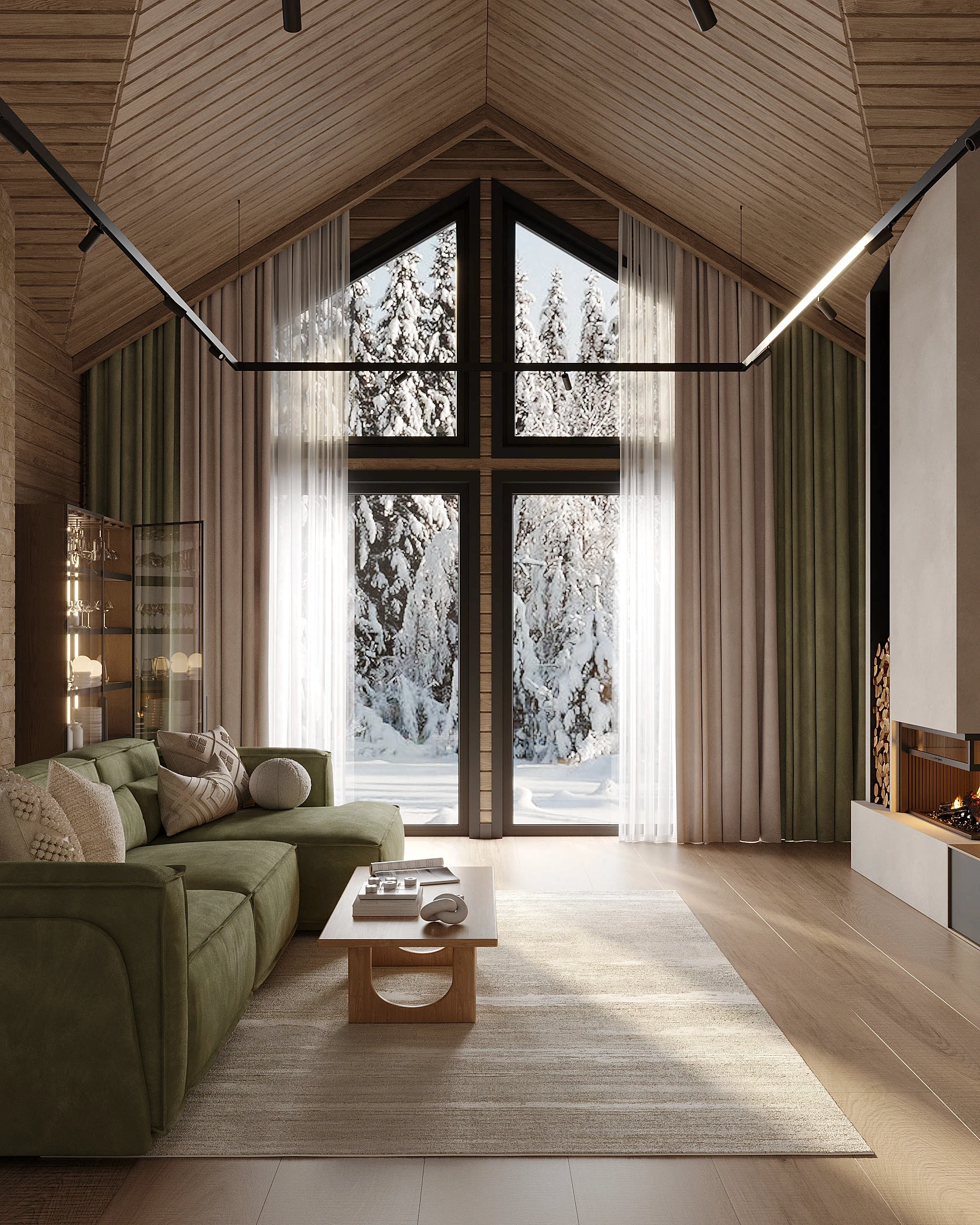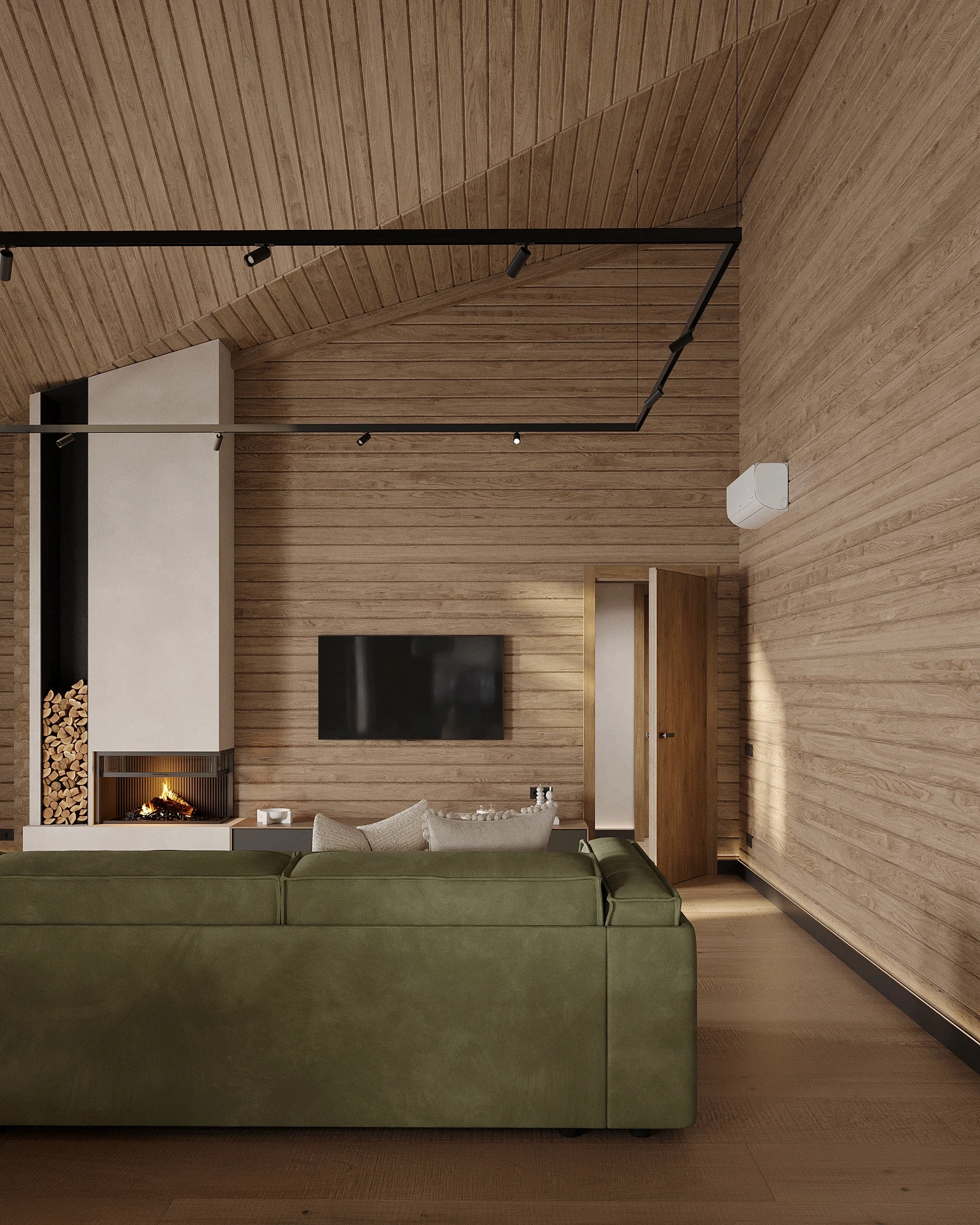 Інтер’єр, у якому природа стає частиною простору. Тепле дерево, м’які відтінки та зелений акцент створюють атмосферу спокою і глибини. Простір побудований на тактильності: гладка деревина, камін, м’які тканини й природне світло формують відчуття домашнього тепла.