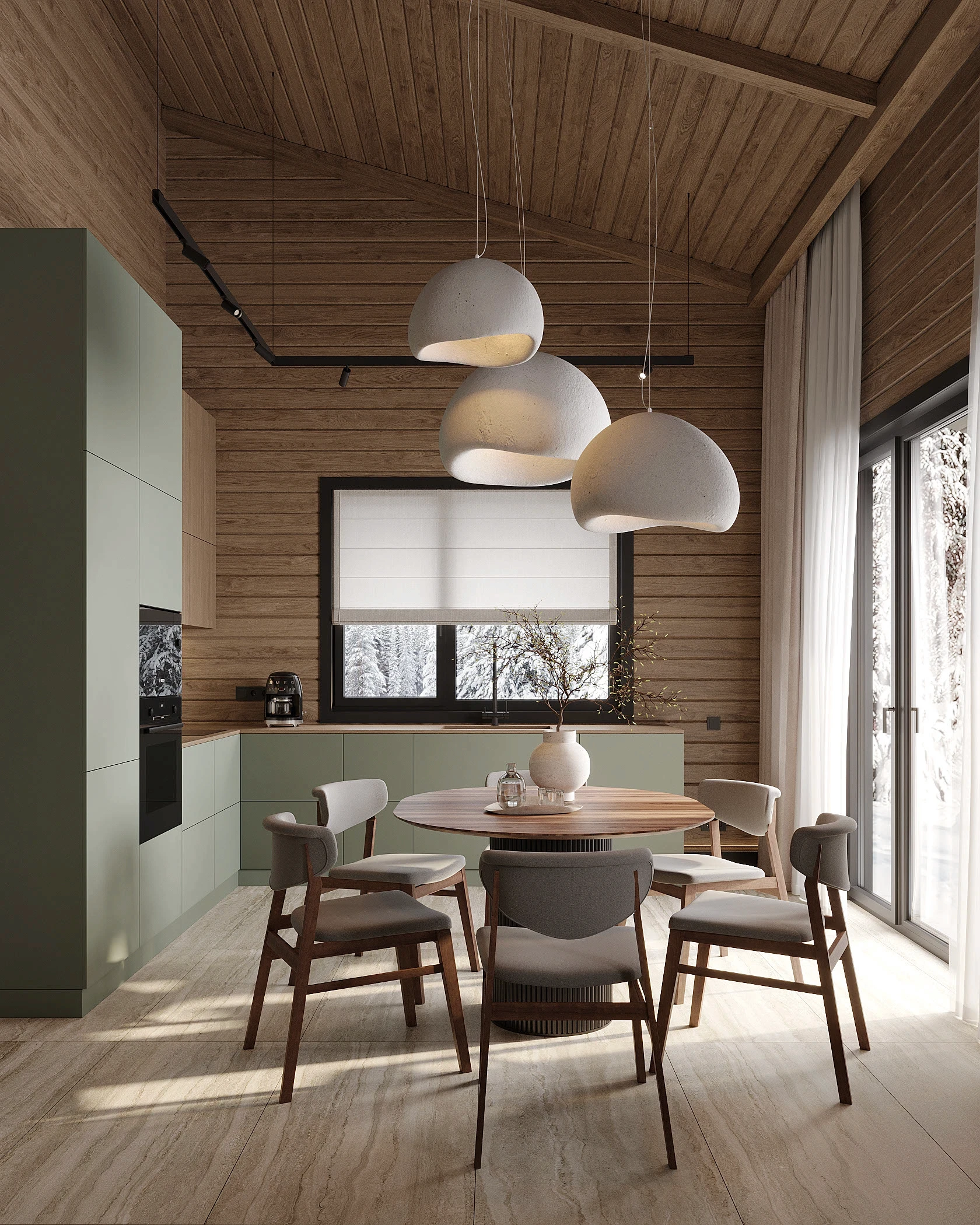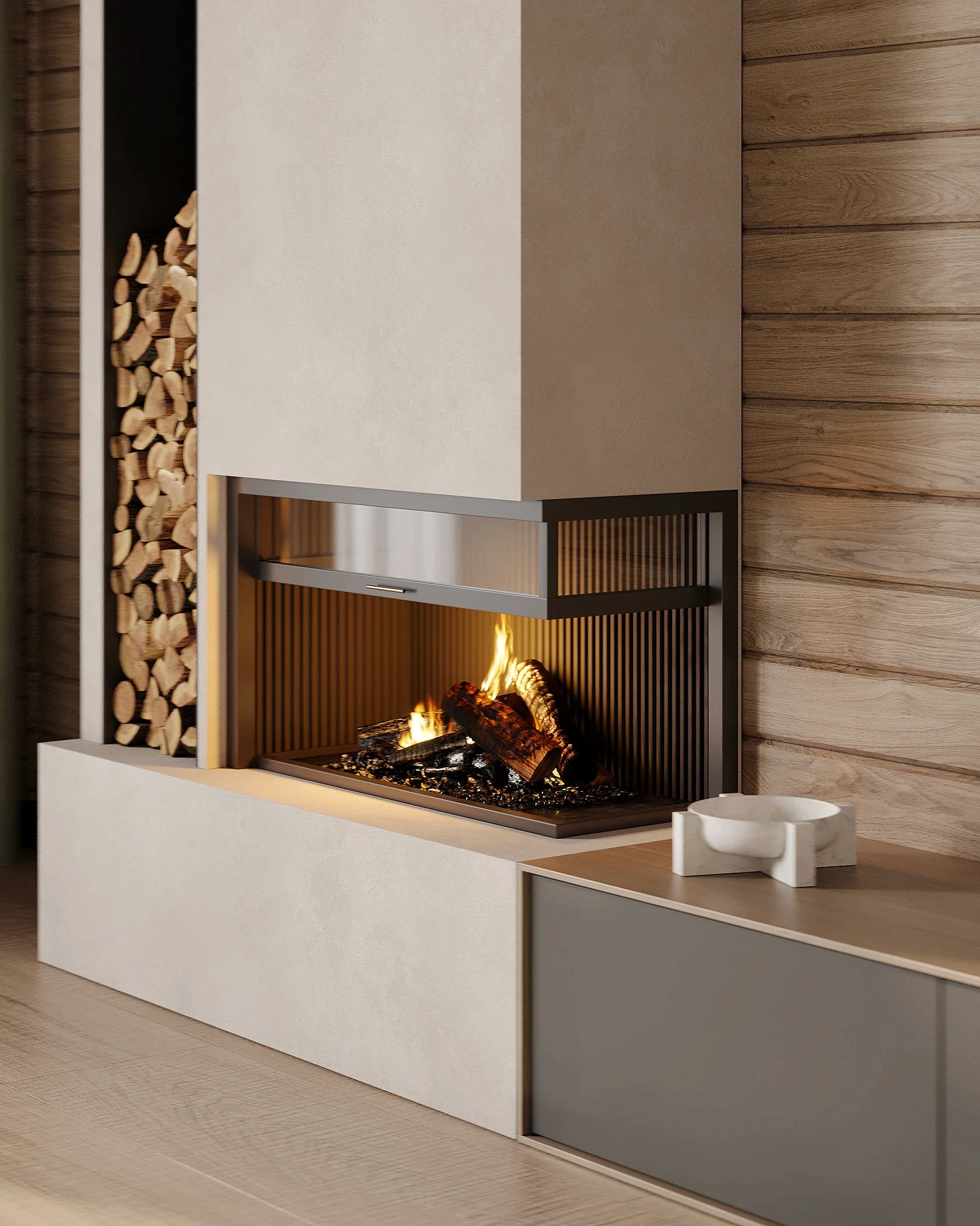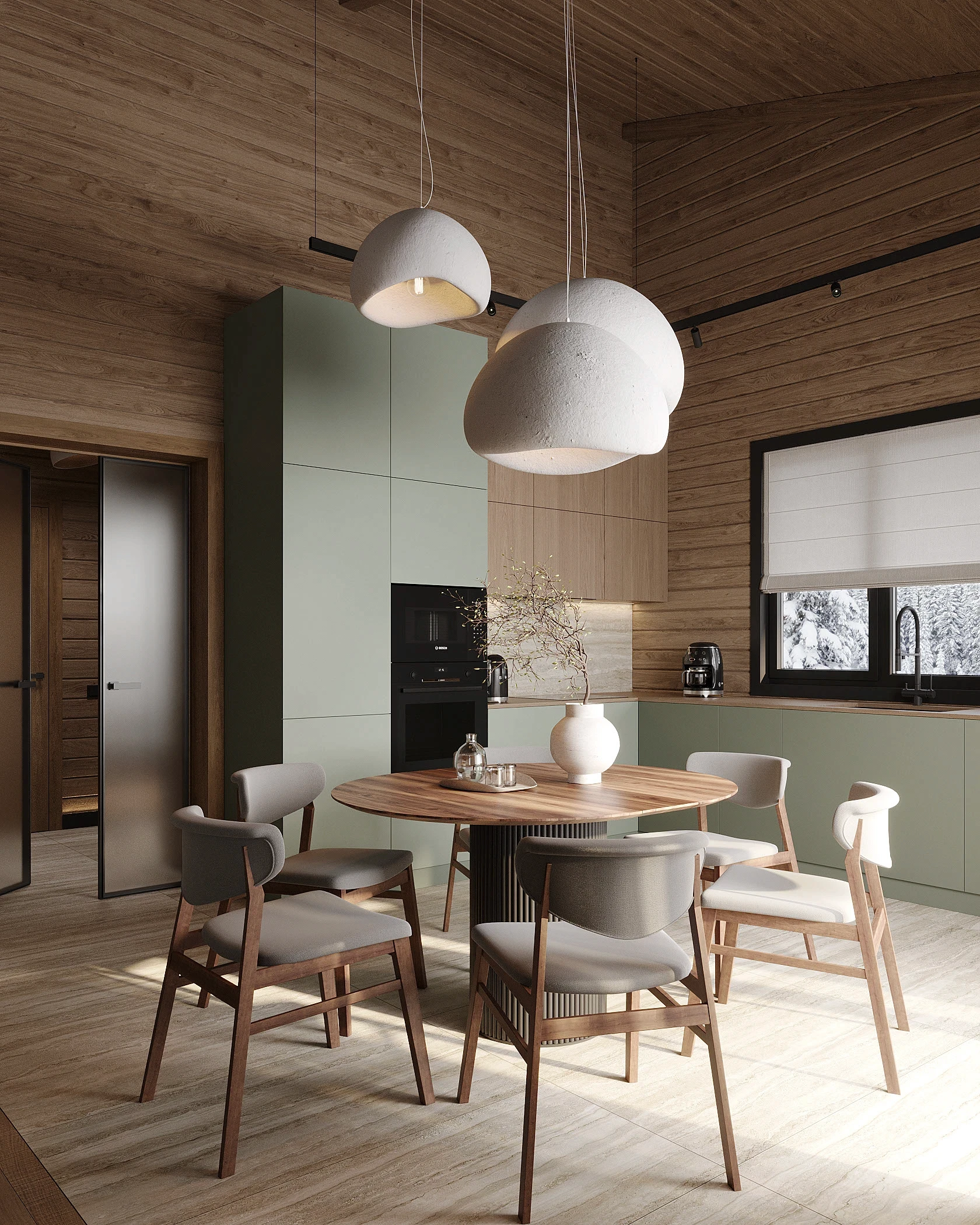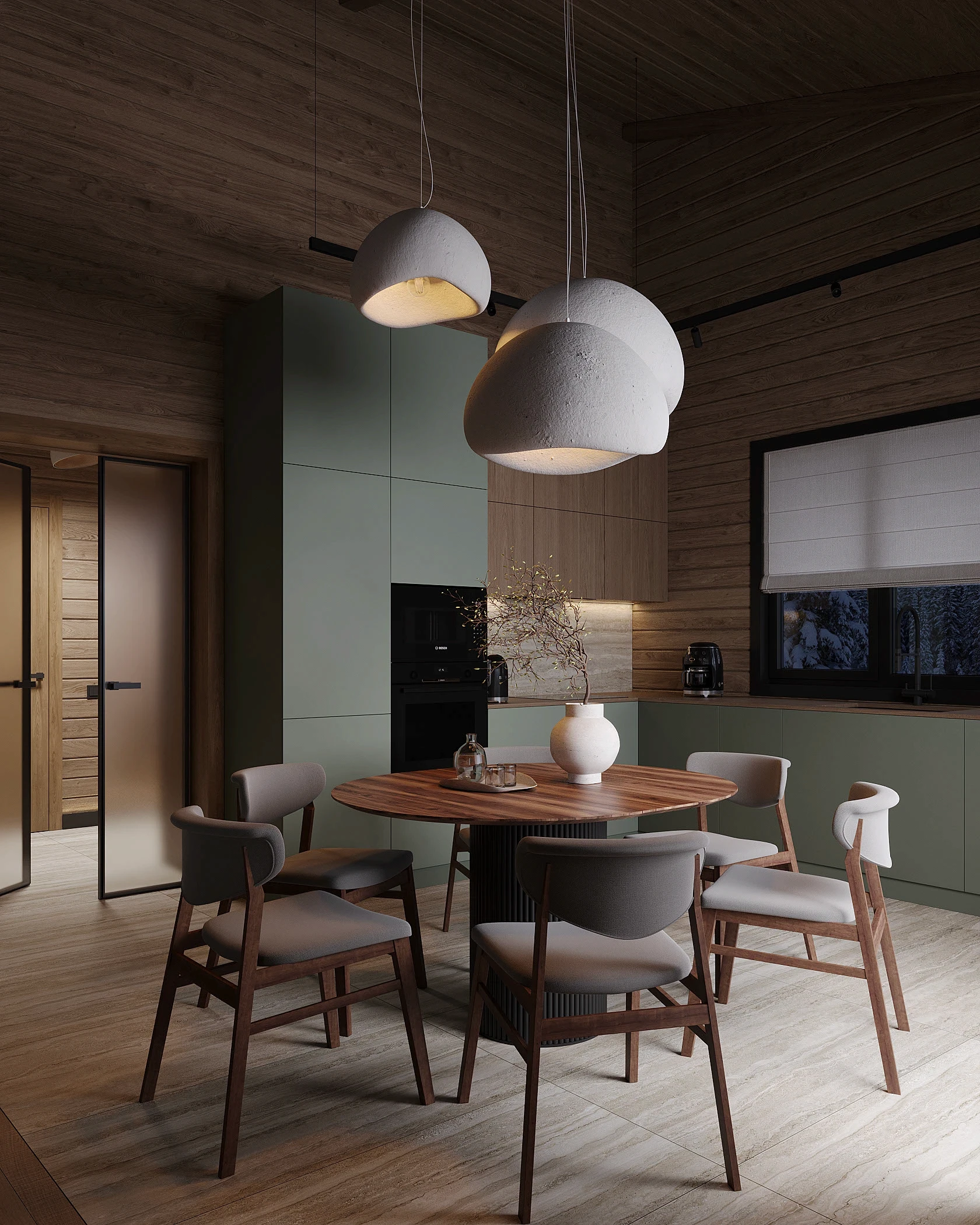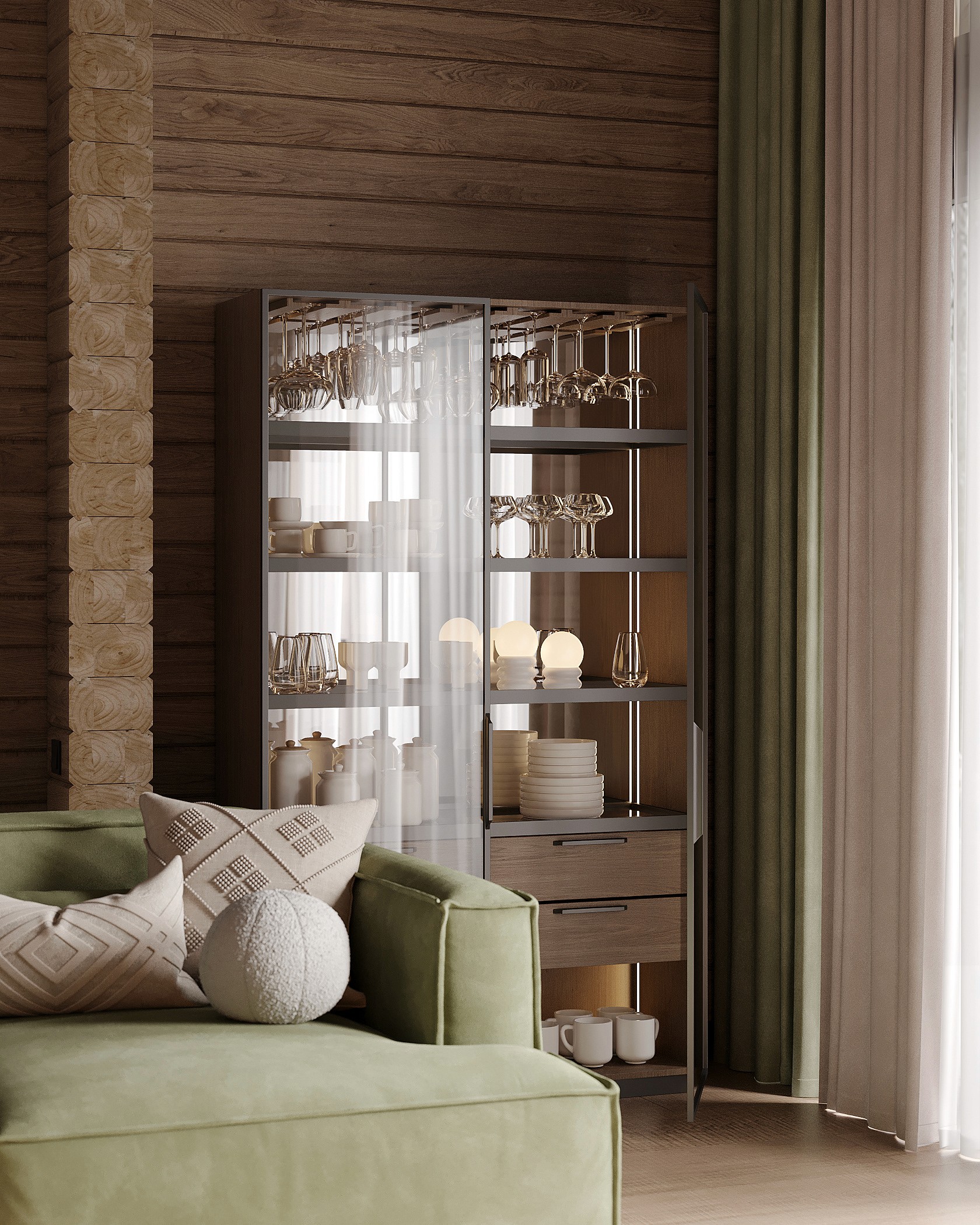 Інтер’єр, у якому природа стає частиною простору. Тепле дерево, м’які відтінки та зелений акцент створюють атмосферу спокою і глибини. Простір побудований на тактильності: гладка деревина, камін, м’які тканини й природне світло формують відчуття домашнього тепла.