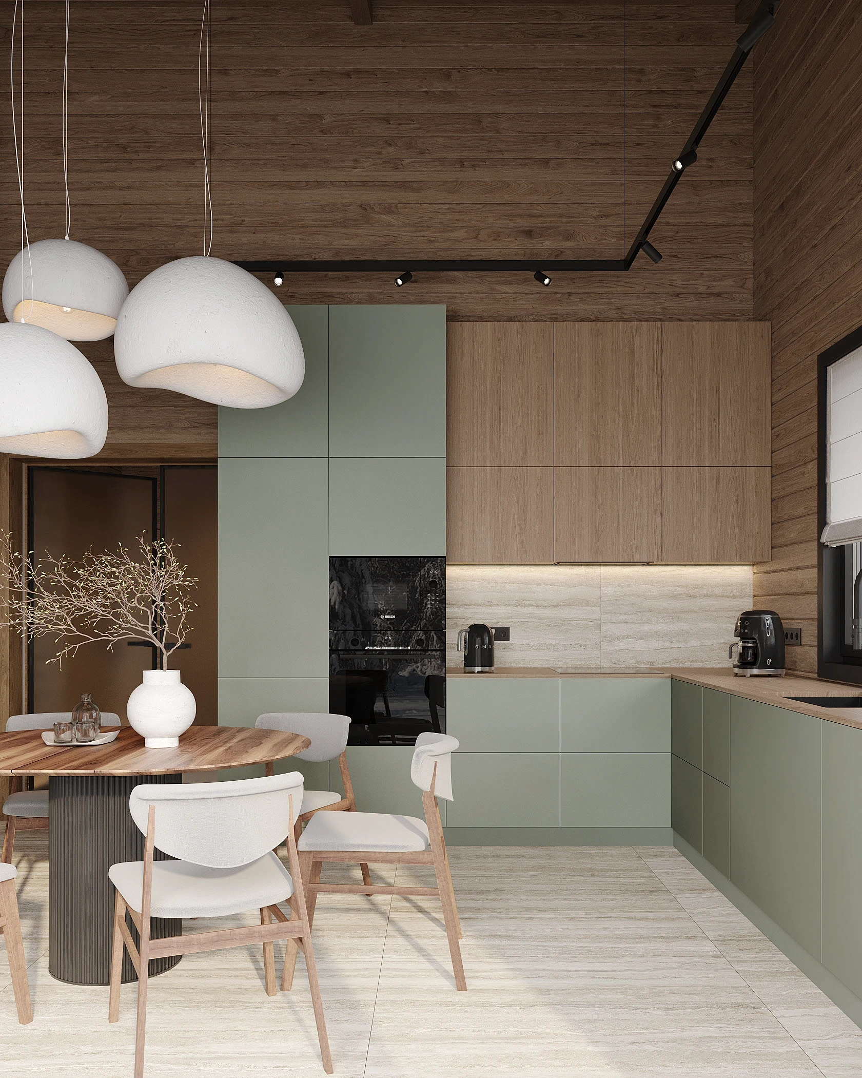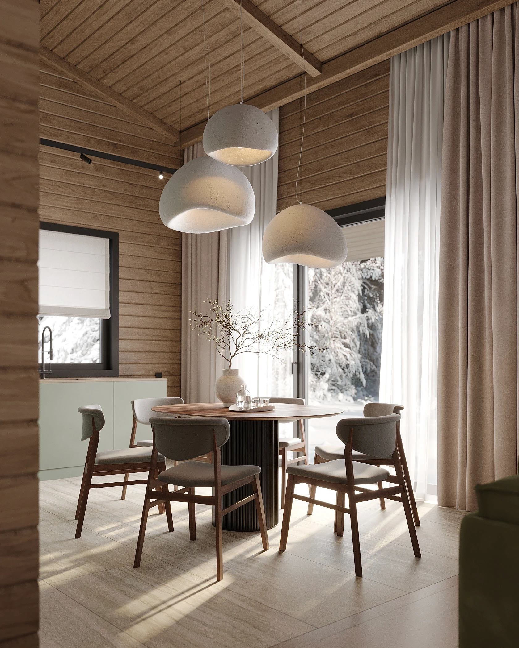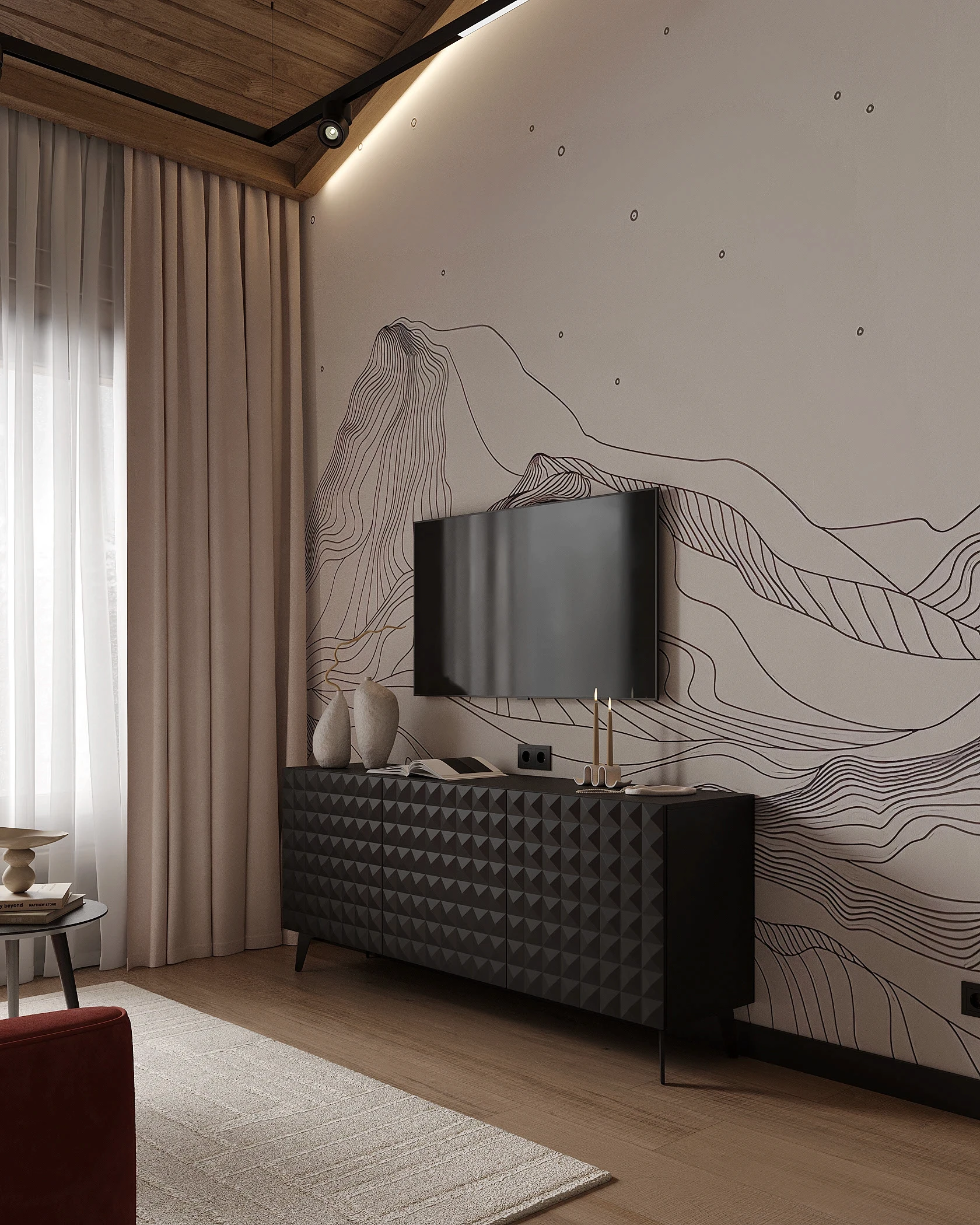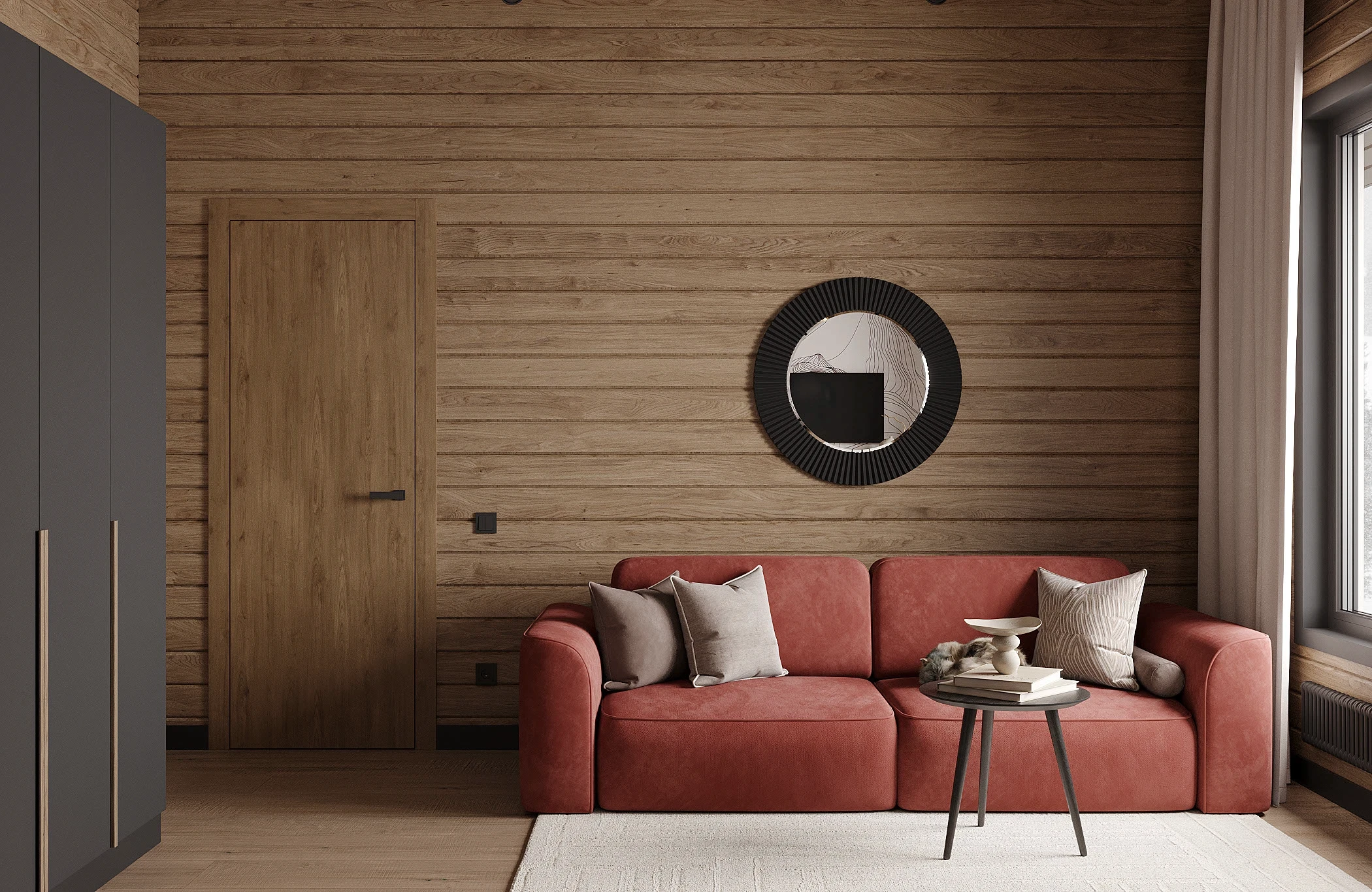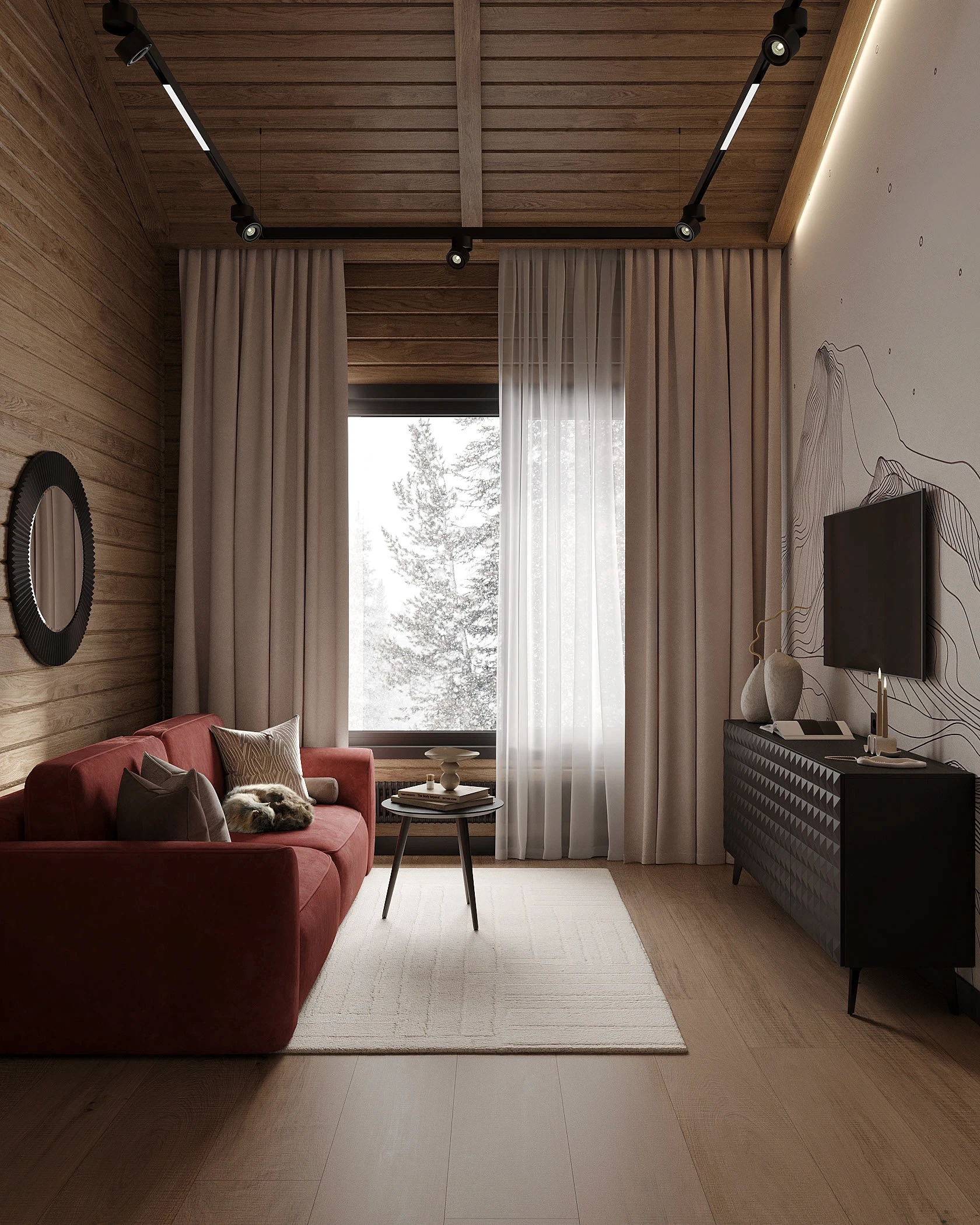 Інтер’єр, у якому природа стає частиною простору. Тепле дерево, м’які відтінки та зелений акцент створюють атмосферу спокою і глибини. Простір побудований на тактильності: гладка деревина, камін, м’які тканини й природне світло формують відчуття домашнього тепла.