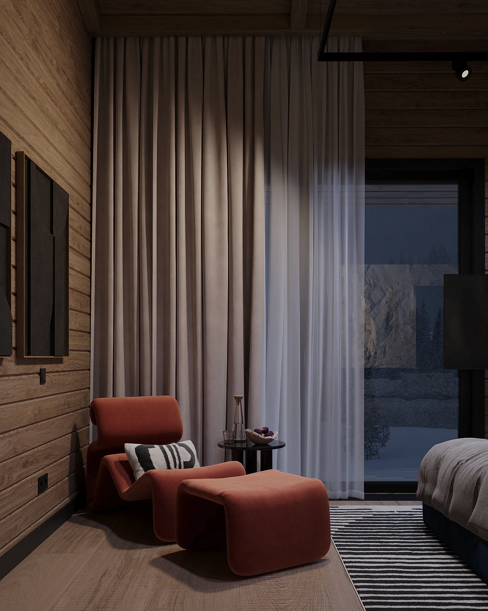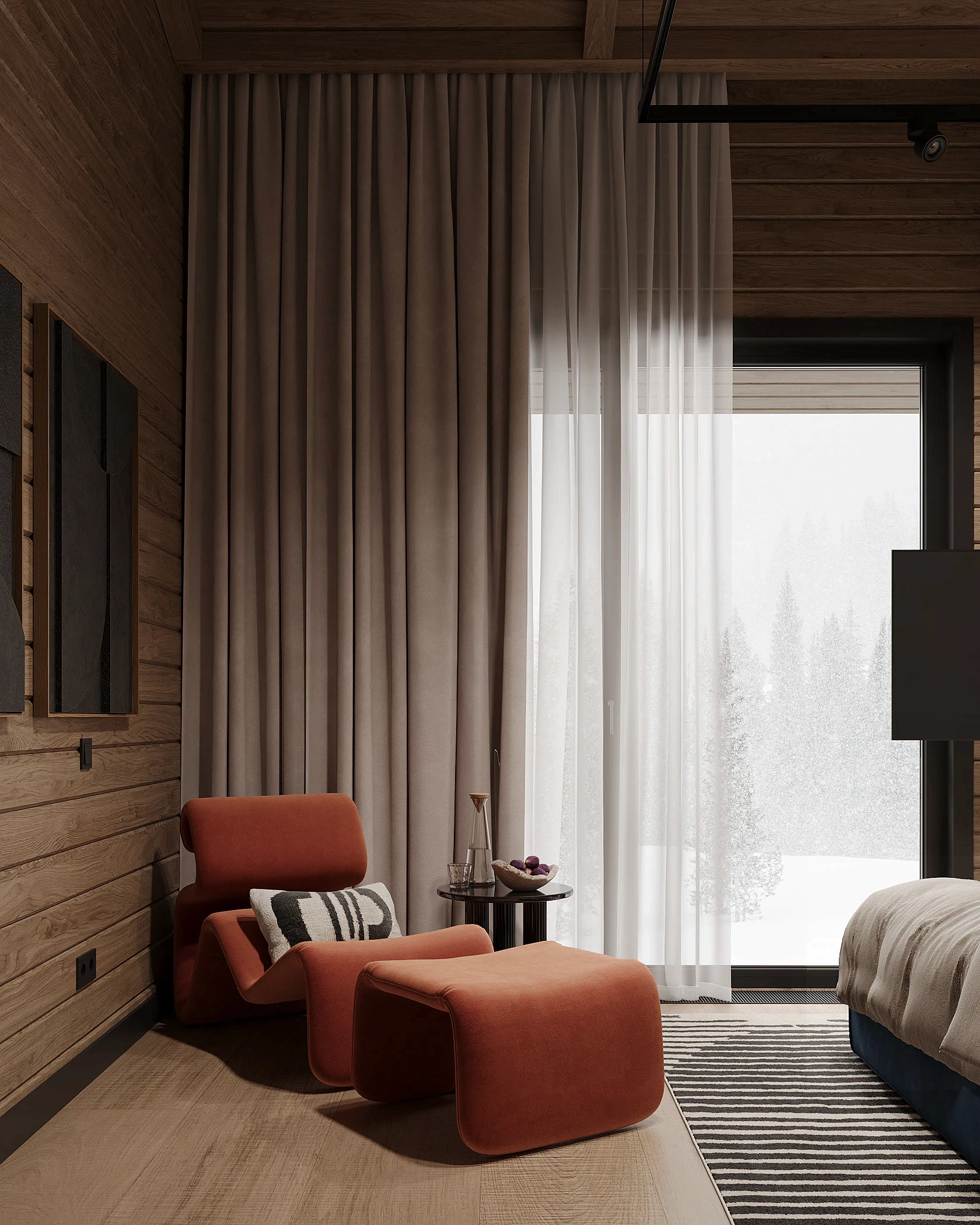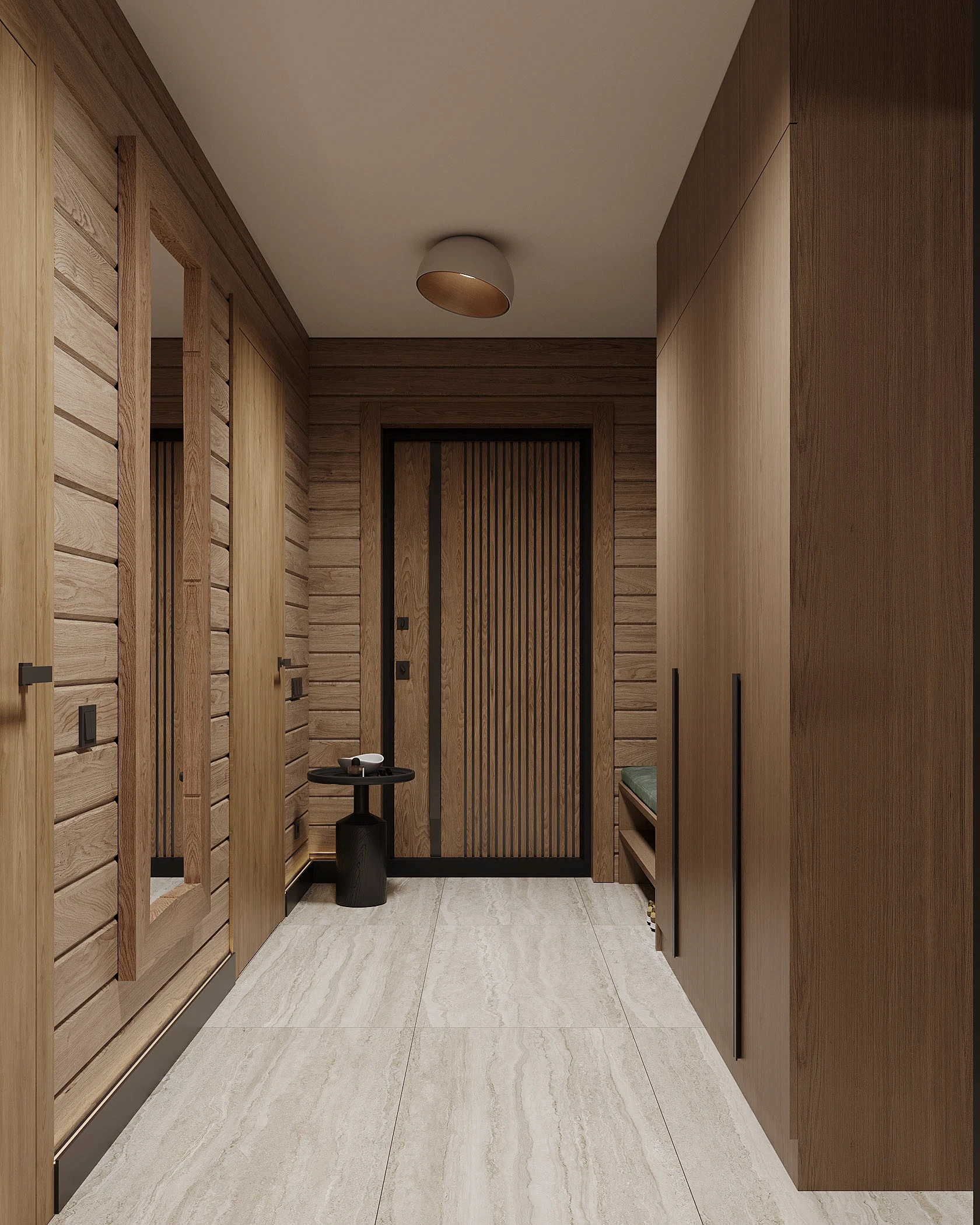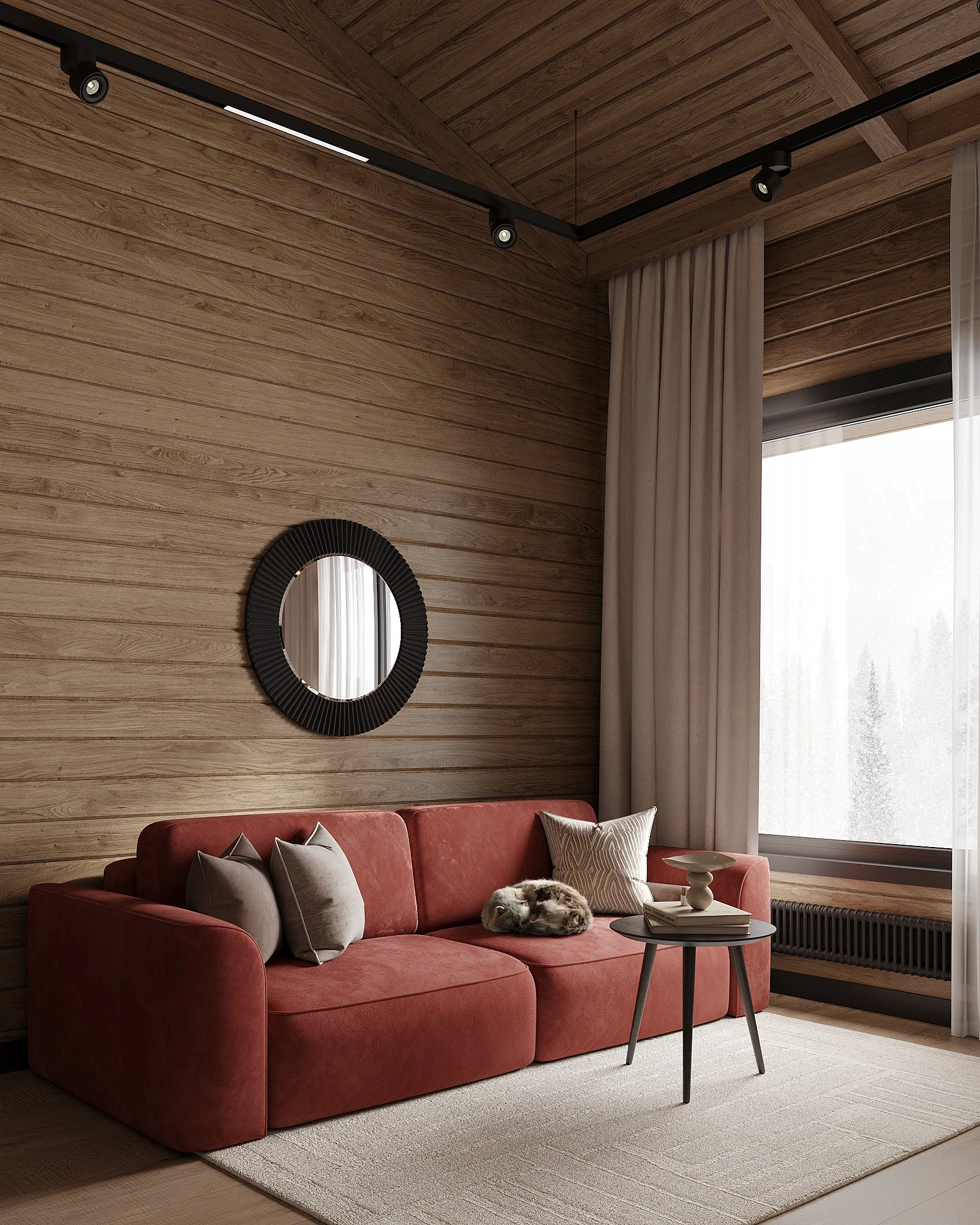 Інтер’єр, у якому природа стає частиною простору. Тепле дерево, м’які відтінки та зелений акцент створюють атмосферу спокою і глибини. Простір побудований на тактильності: гладка деревина, камін, м’які тканини й природне світло формують відчуття домашнього тепла.