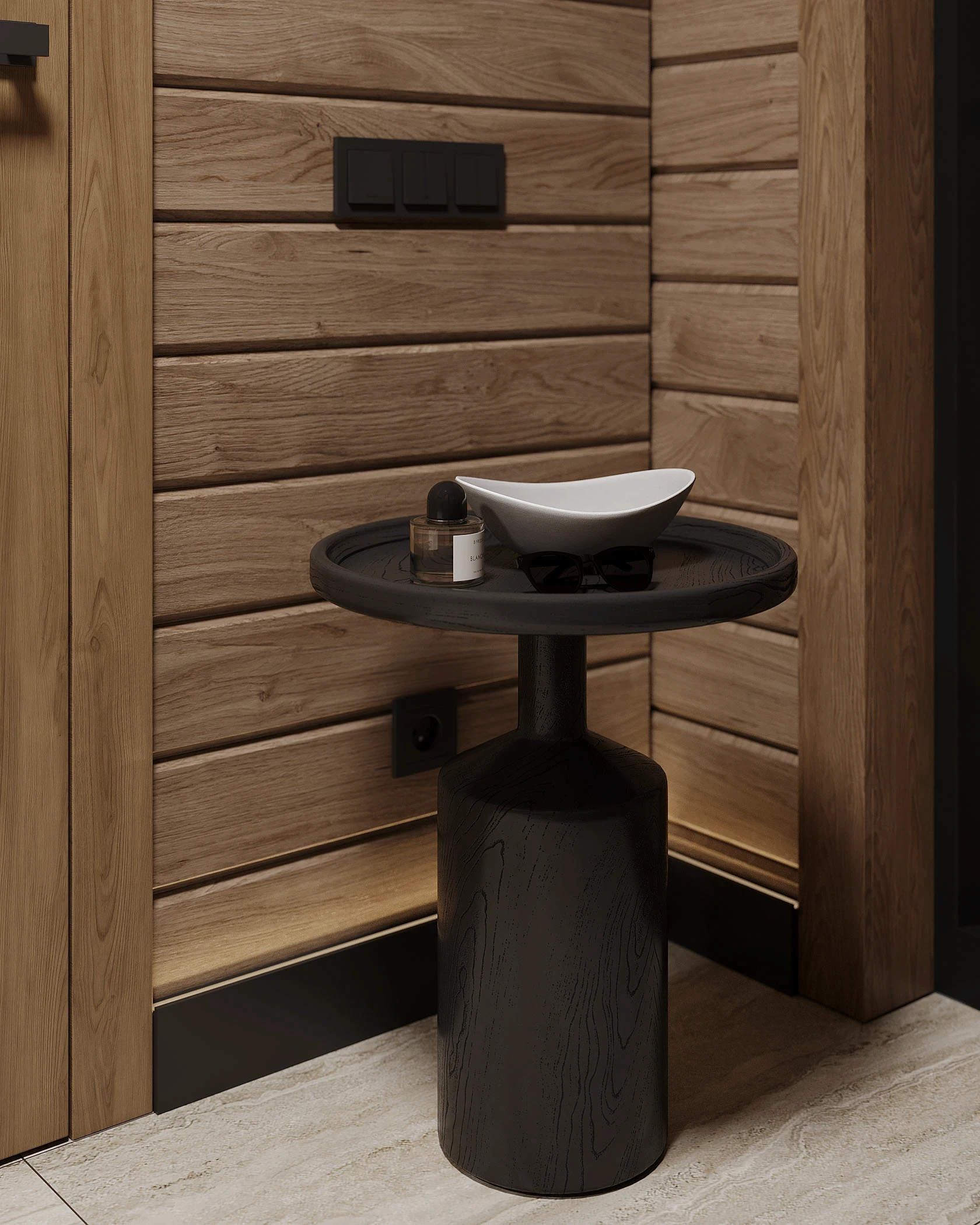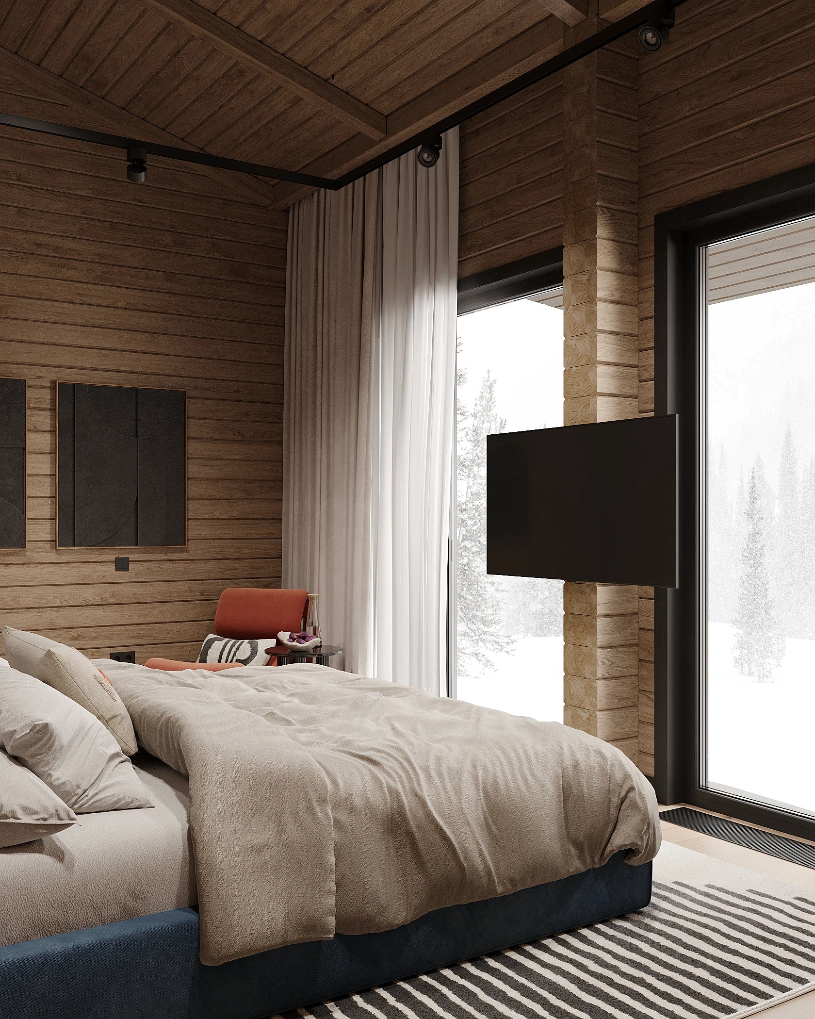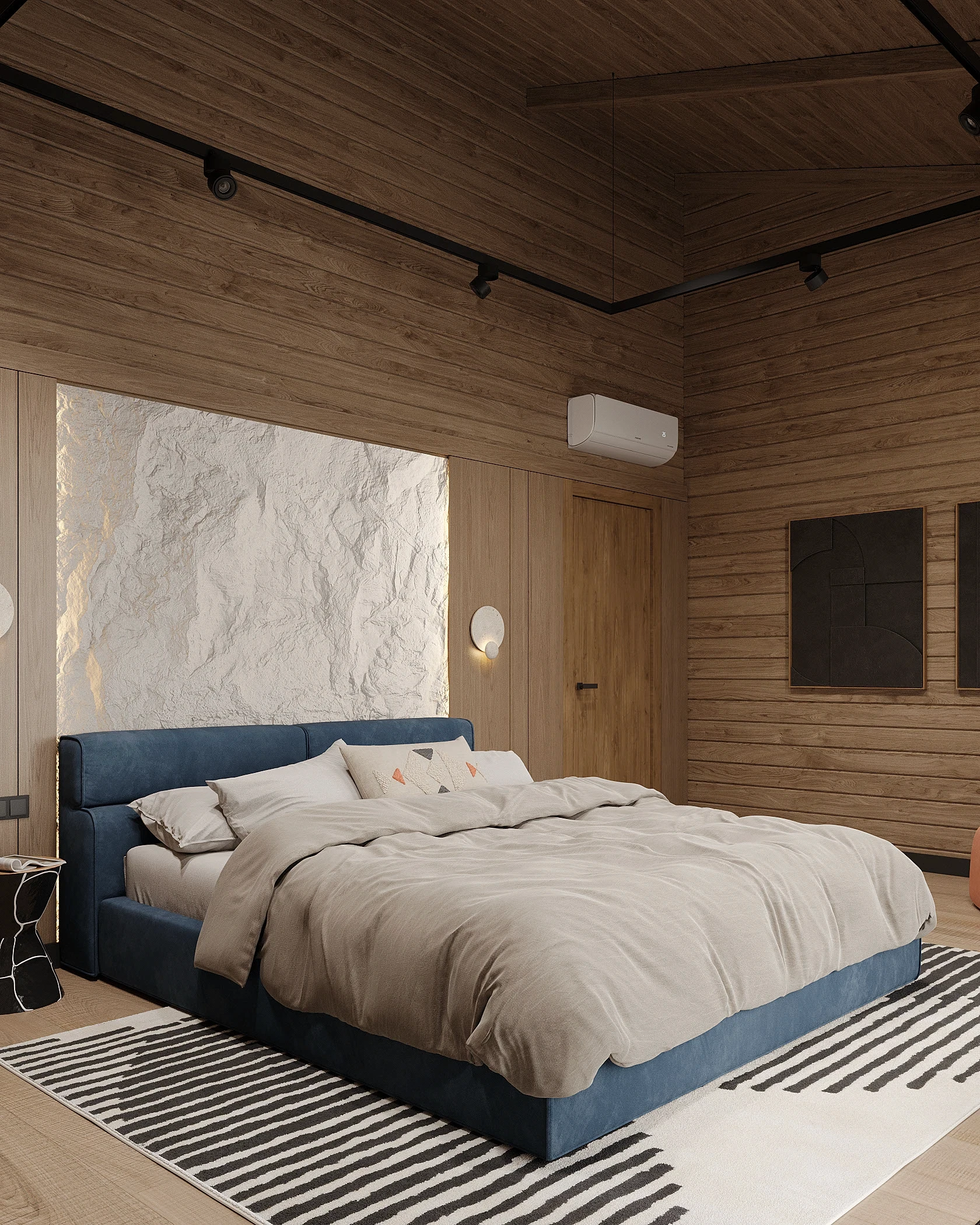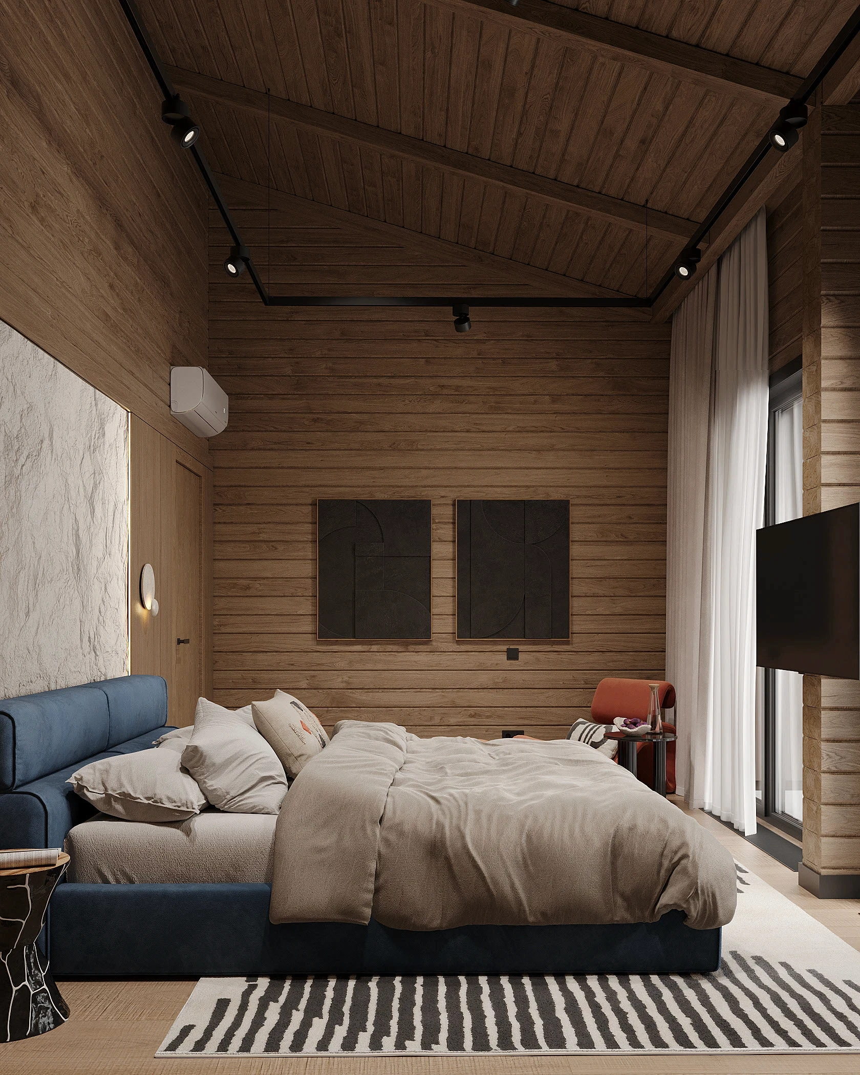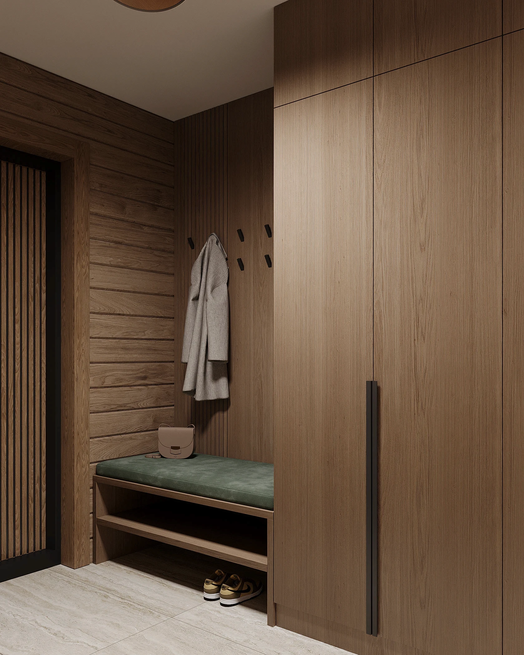 Інтер’єр, у якому природа стає частиною простору. Тепле дерево, м’які відтінки та зелений акцент створюють атмосферу спокою і глибини. Простір побудований на тактильності: гладка деревина, камін, м’які тканини й природне світло формують відчуття домашнього тепла.