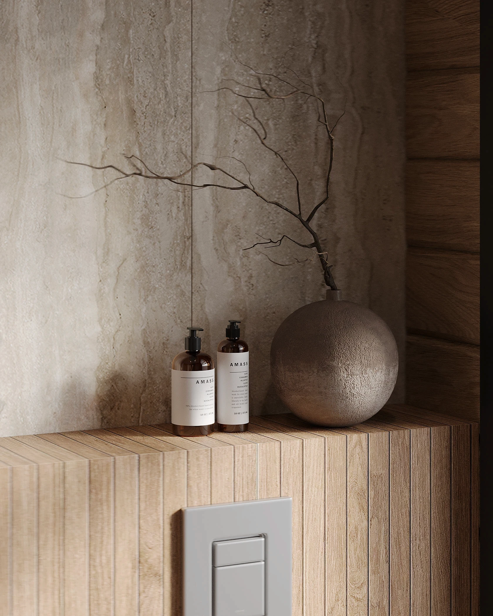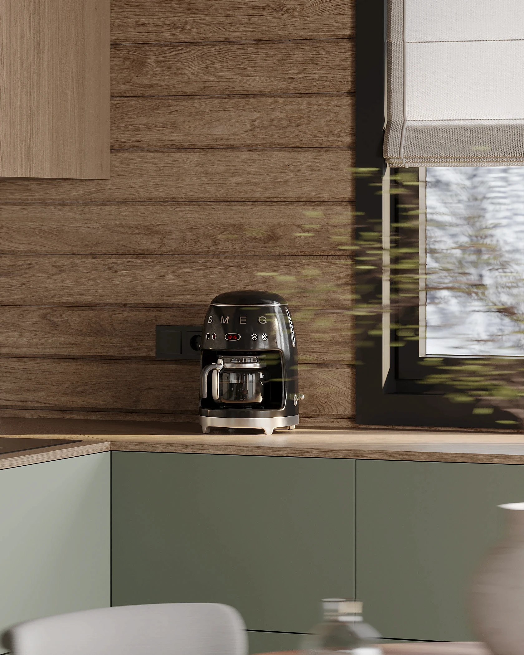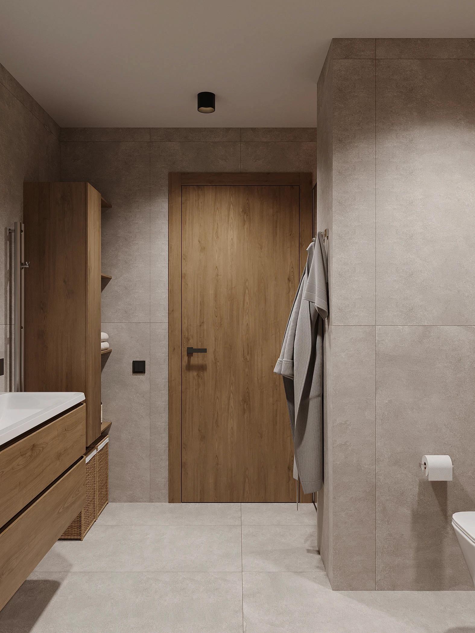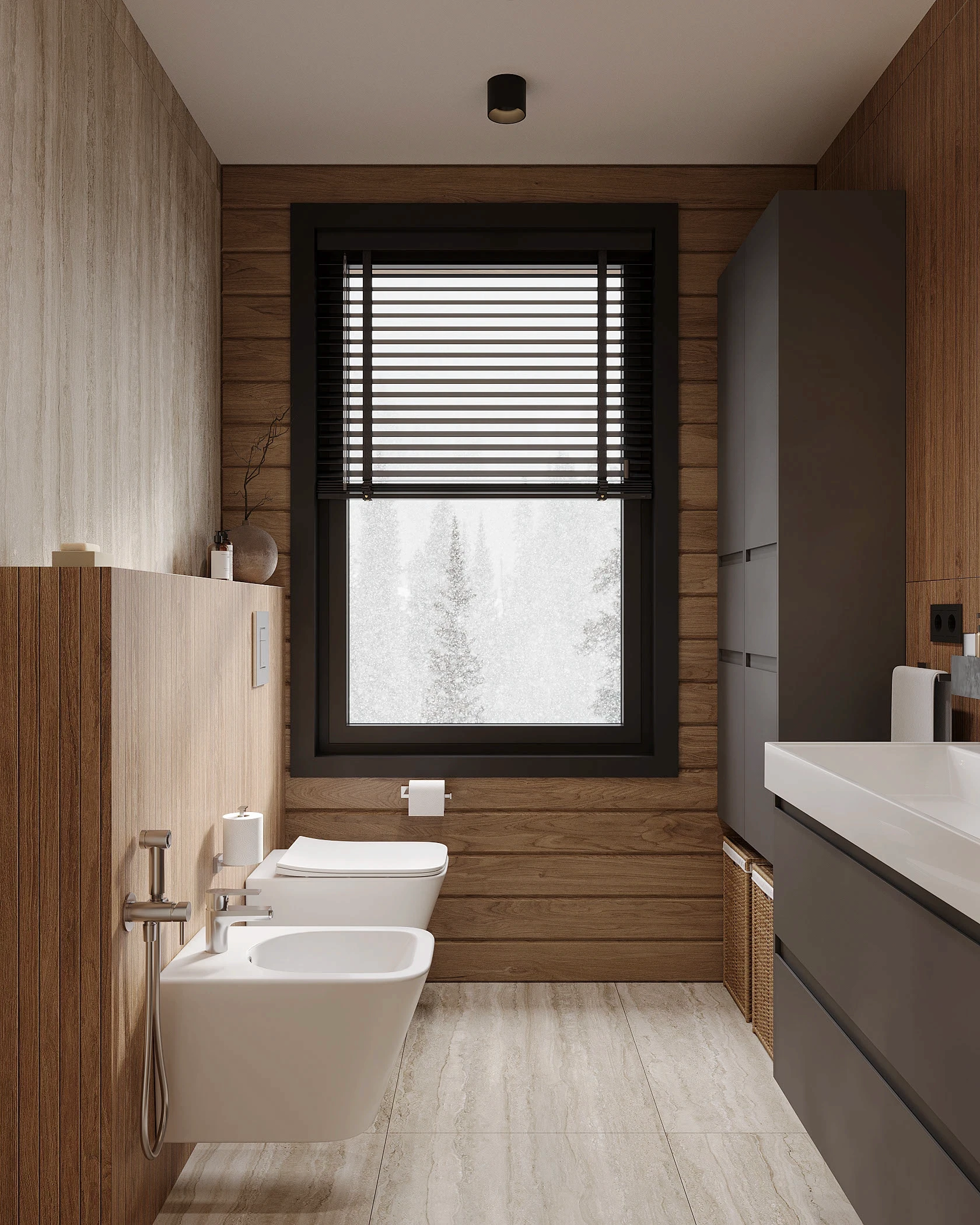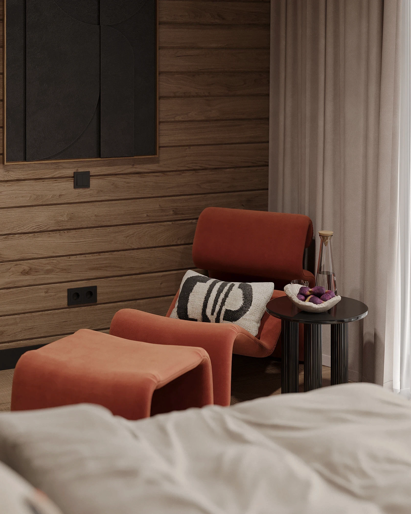 Інтер’єр, у якому природа стає частиною простору. Тепле дерево, м’які відтінки та зелений акцент створюють атмосферу спокою і глибини. Простір побудований на тактильності: гладка деревина, камін, м’які тканини й природне світло формують відчуття домашнього тепла.